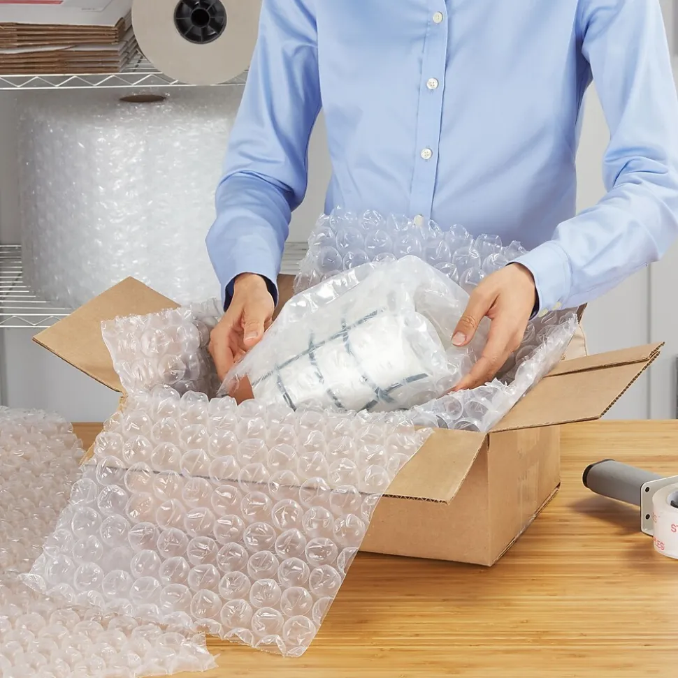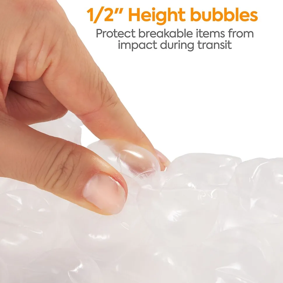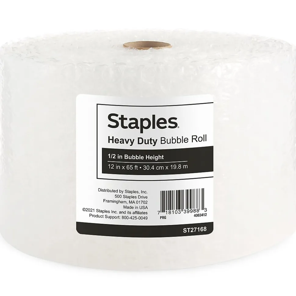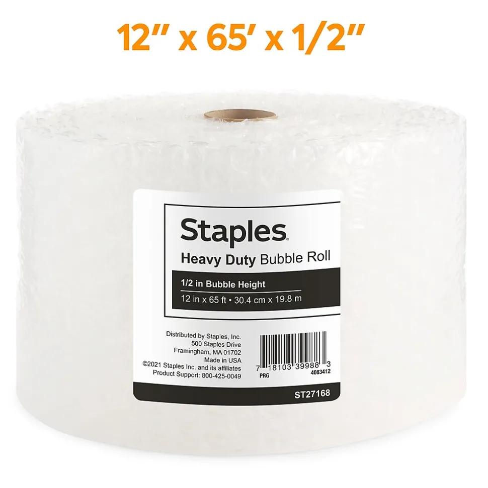 Seal delicate goods to be stocked or shipped with this heavy-duty bubble roll. Its 1/2-inch-thick bubble cushioning is strong and pop-resistant to help protect breakable items from impact during transit. This Staples bubble wrap roll measures 12 inches wide and 65 feet long and is perforated every 12 inches for easy tearing.