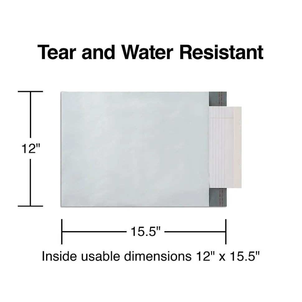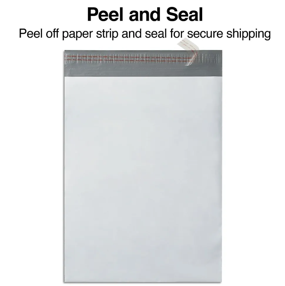 Keep contents protected during transit with these poly mailers. The EasyClose design lets you quickly seal the contents and offers long-lasting closure, while the poly material securely holds stamps and labels. These Staples 12 x 15.5-inch peel-and-seal poly mailers are water-resistant and puncture-resistant for enhanced durability and strength, and the white surface accepts ink, offering clear visibility.