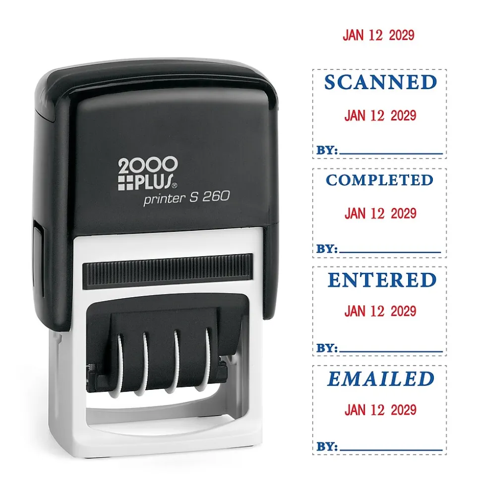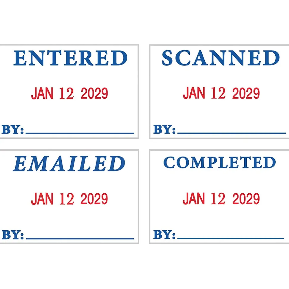 Self-inking message stamp features four interchangeable messages: Scanned, Emailed, Entered and Completed. Two-color pad for message and date. Ink colors: red and blue. Five-year date band. Perfect for office use.