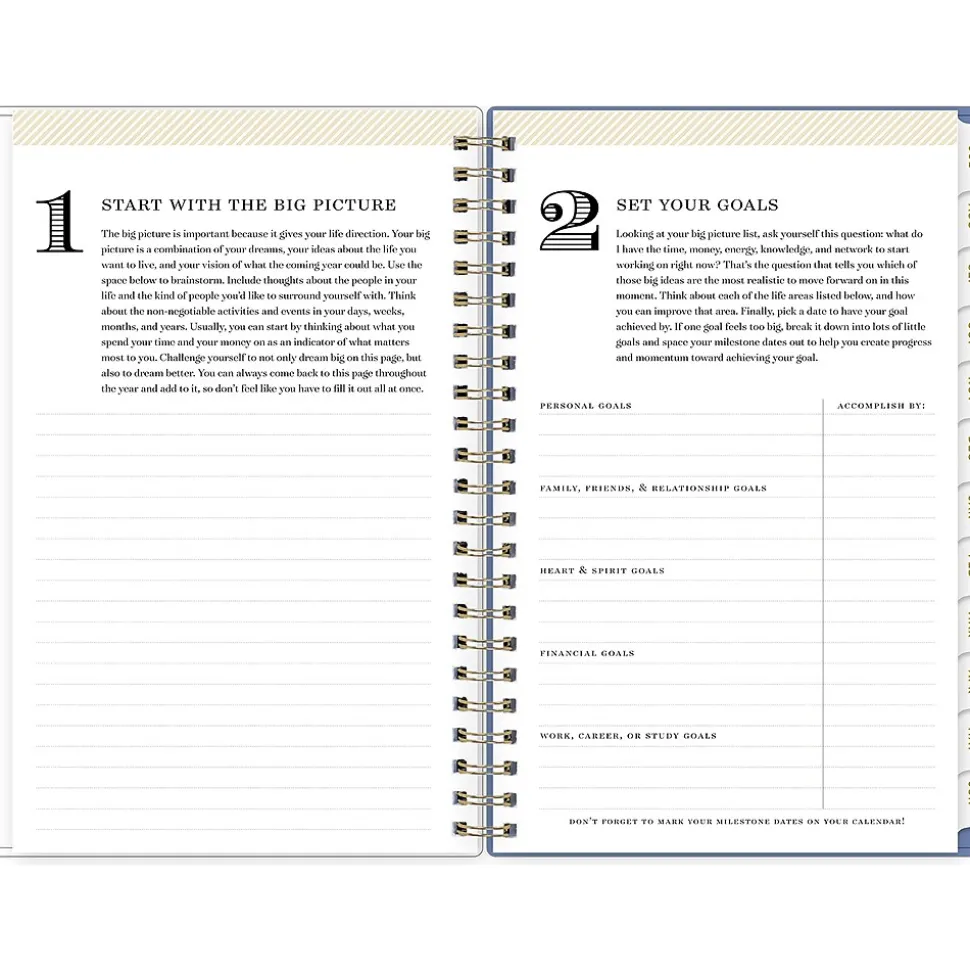 - Storage pocket, gold-tone foil stickers, yearly overview, and goal setting pages