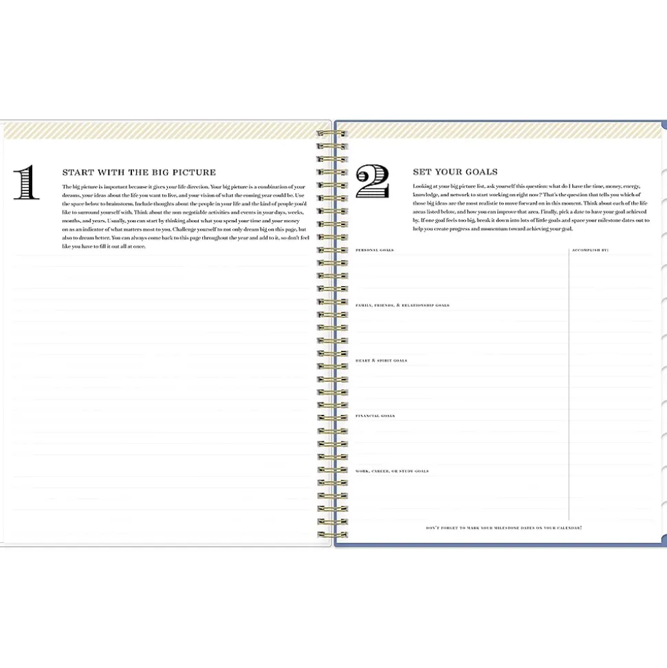 - Storage pocket, gold-tone foil stickers, yearly overview, and goal setting pages
