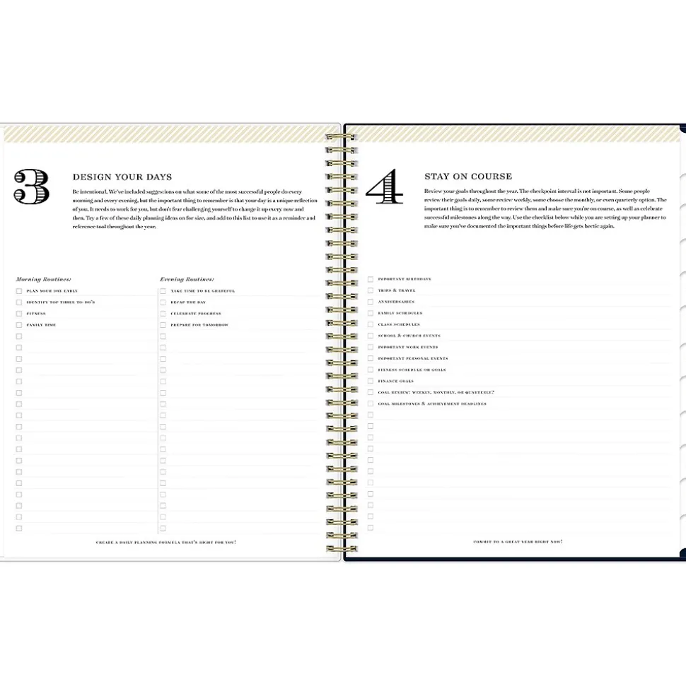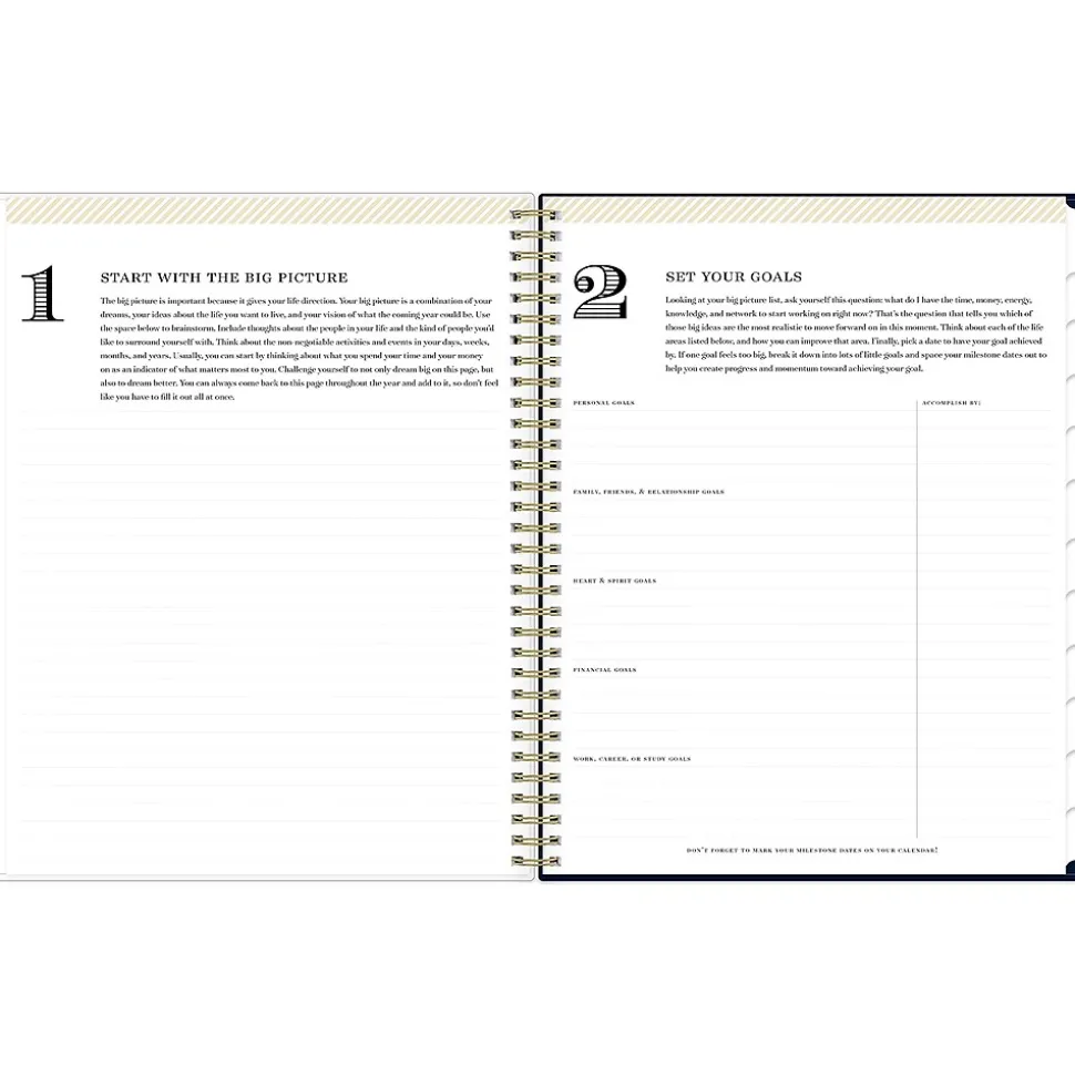 - Features one month per two pages and one week per two pages, with four-step guide to goal setting, two-year reference calendar, weekly quotes, and space for notes