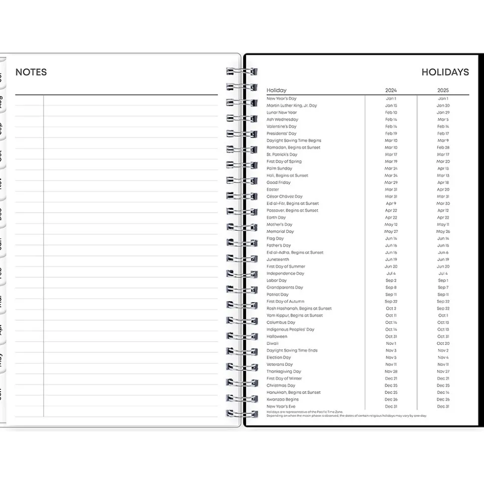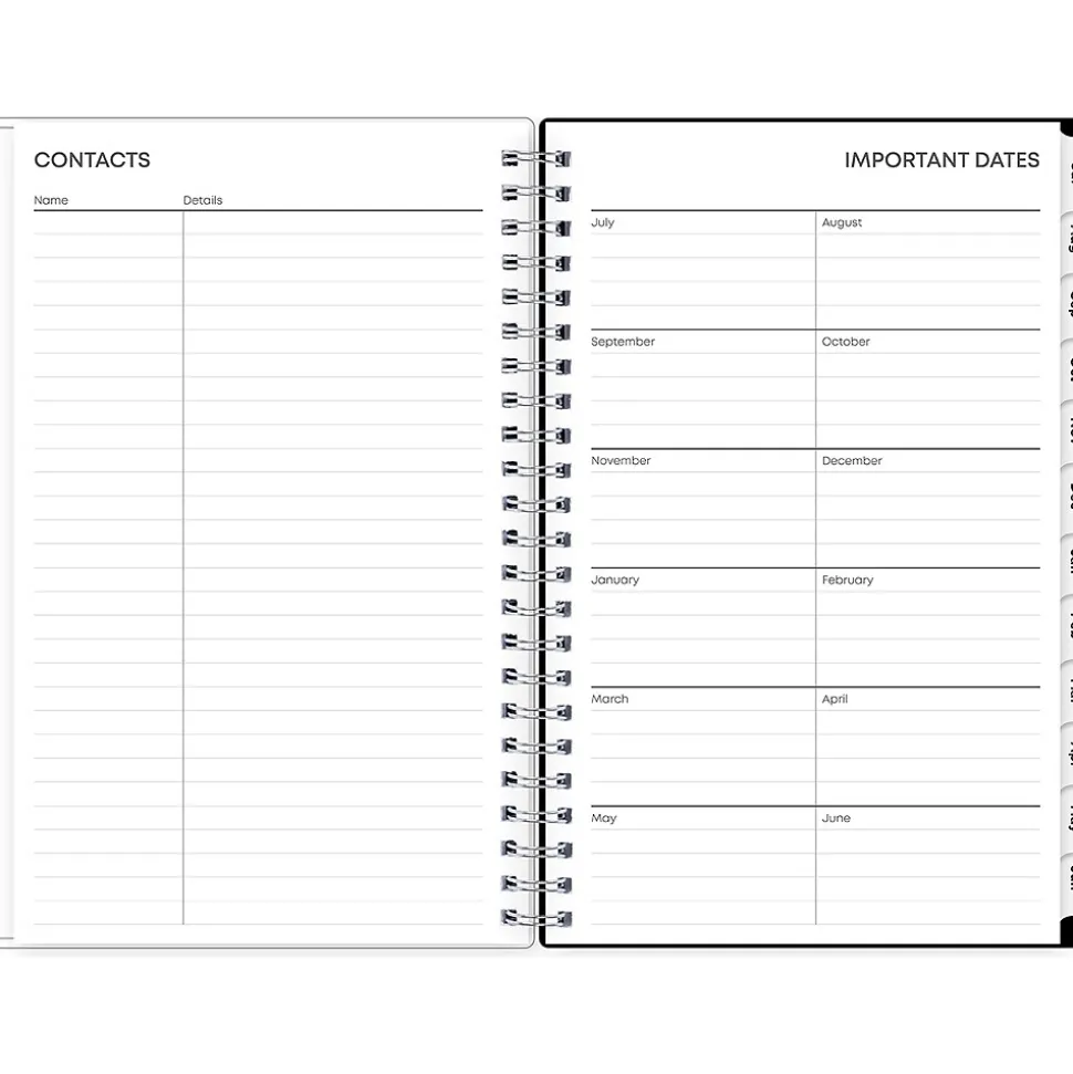 - One week per view, one month per view, notes pages and reference calendars, contacts, goals, holidays, and important dates