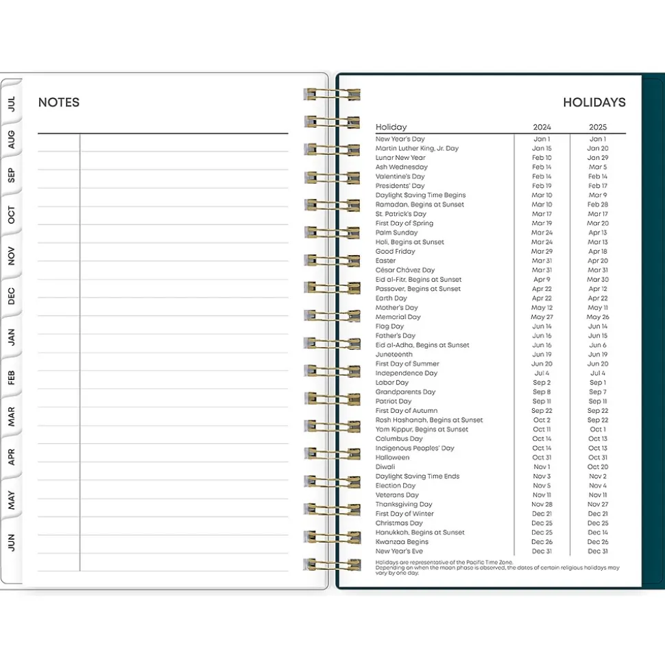 - Features weekly and monthly pages, with space for notes and a list of holidays