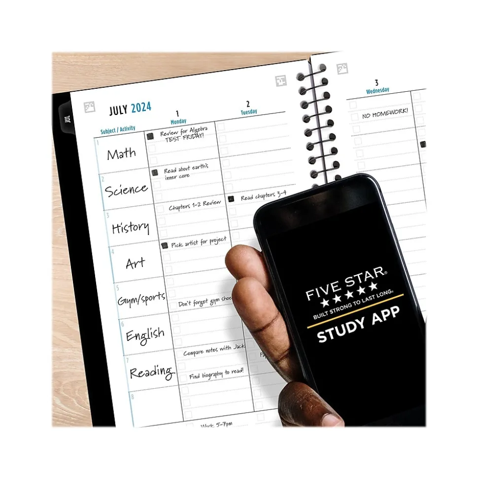 Customize your look and manage a full class load with this Five Star planner. The clear front lets you insert a custom cover page, while weekly and monthly planning pages make it easy to keep track of assignments, priorities, and key dates.