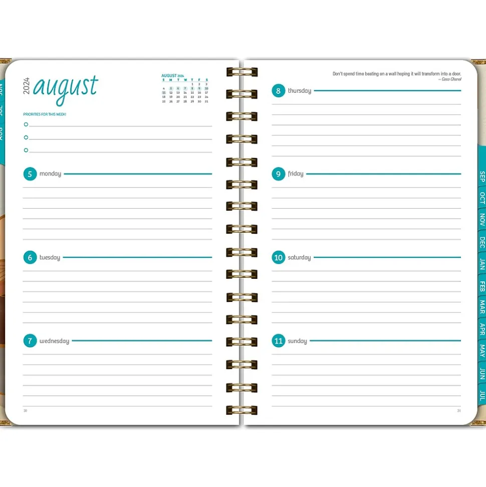 - Two-page monthly spreads with space for notes and previous and next month reference; two-page weekly spreads with space for top priorities for the week and current month reference calendar