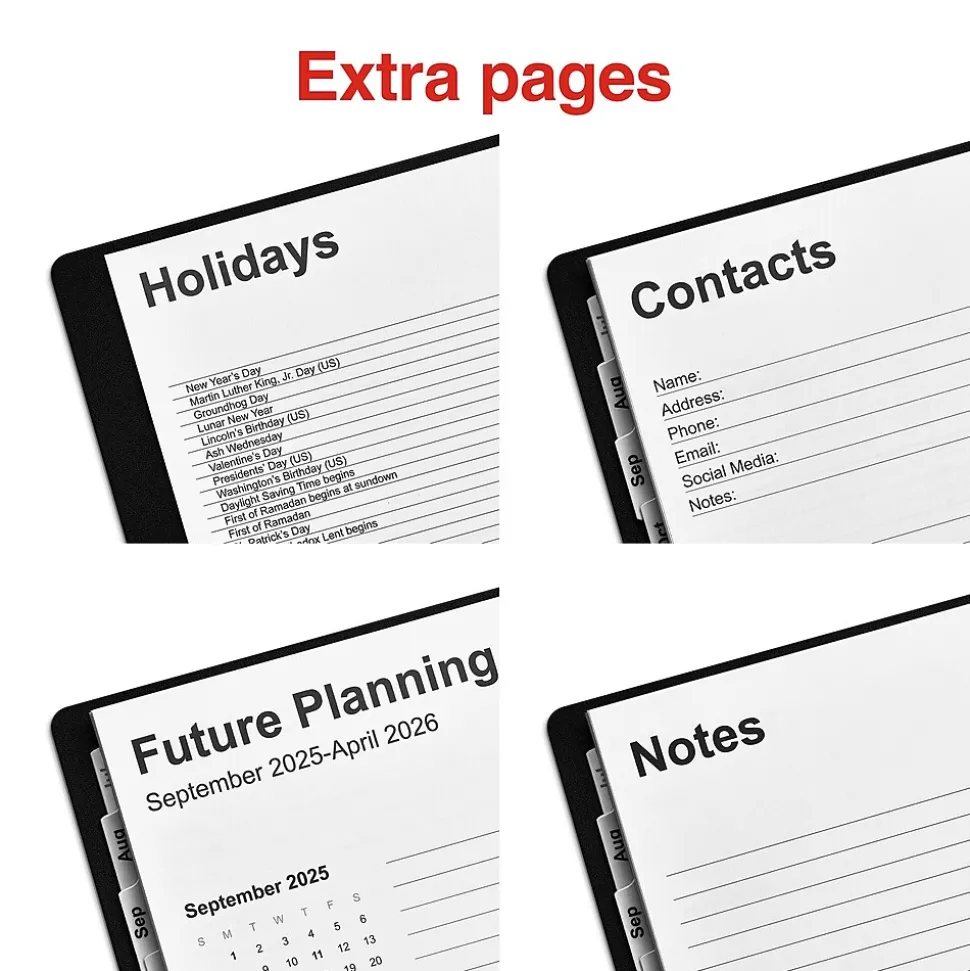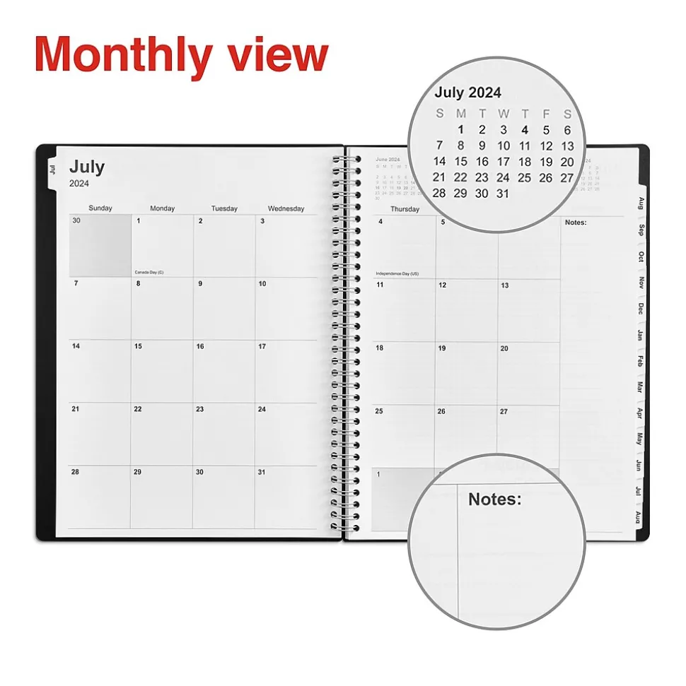 Complete office tasks with this black weekly & monthly planner. The single spiral binding holds the pages together and allows quick flip-throughs, while the poly cover material withstands daily handling. This Staples 8 x 11-inch back July 2024 to June 2025 weekly & monthly planner has 14 tabs for quick access to information and a built-in pocket for receipts and loose sheets.