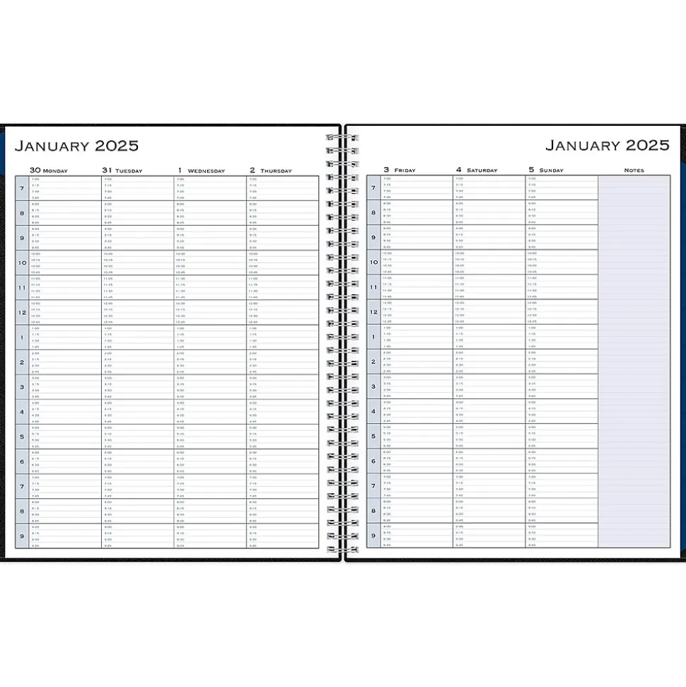 Block out time for meetings with a professional appointment book from Blue Sky. Perfect for office schedules or busy individuals, this 2025 appointment book lets you plan every day of the year in 15-minute increments. Vertical weekly views start at 7:00 a.m. and end at 9:45 p.m.