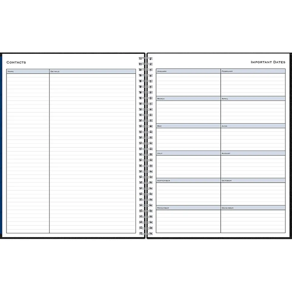 - Storage pocket, yearly overview, goals, contacts, and important dates