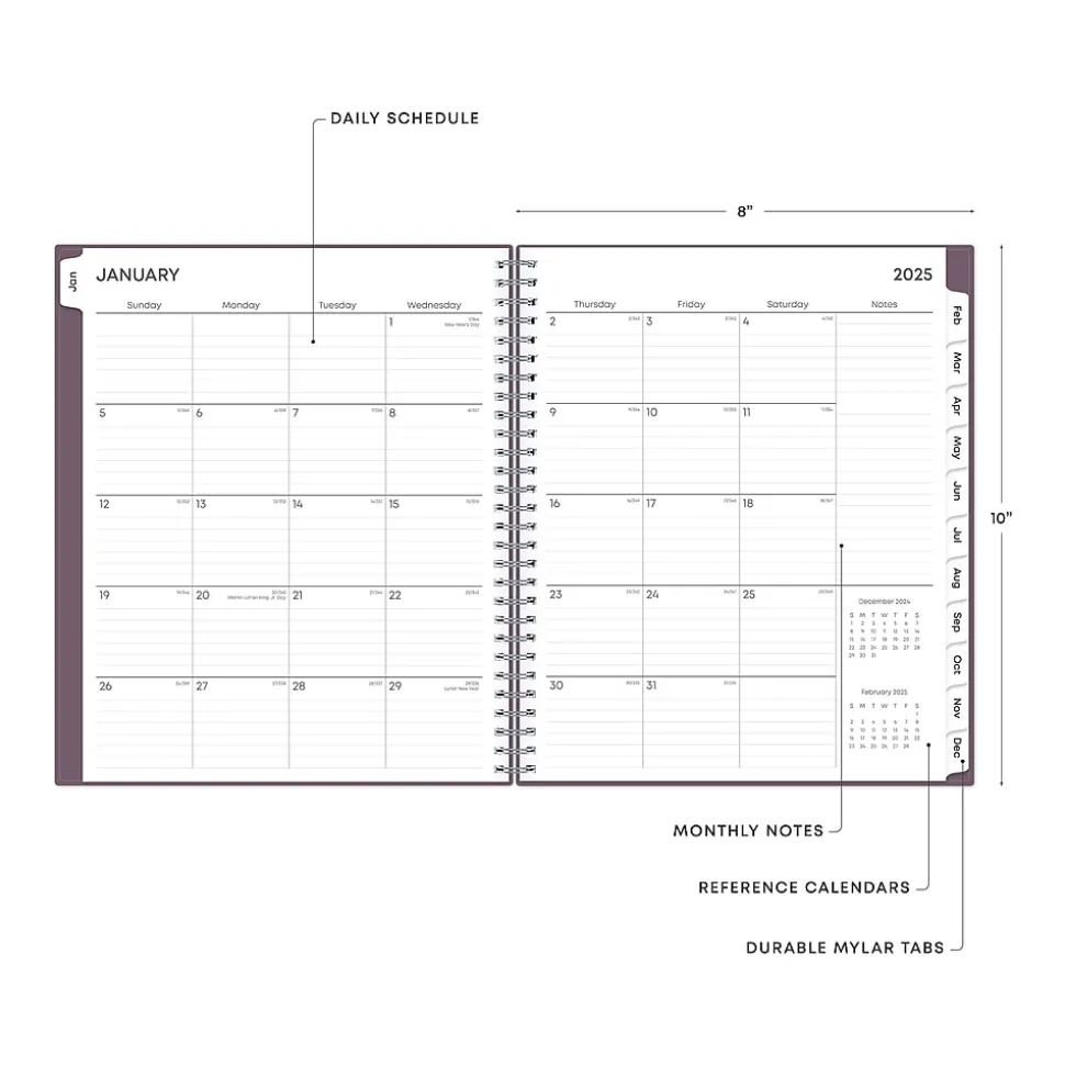 A simple planner with monthly calendars. Track events with this 2025 monthly planner from Blue Sky, featuring 12 tabbed monthly views and plenty of room for notes.