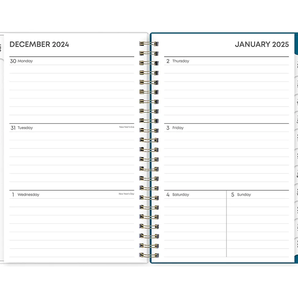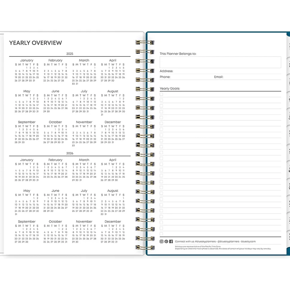 A simple planner for busy schedules. Organize tasks and time with the 2025 weekly and monthly Bakah Blue planner from Blue Sky. Use the weekly layouts, tabbed monthly views, and notes pages to effectively manage your schedule and achieve your goals.