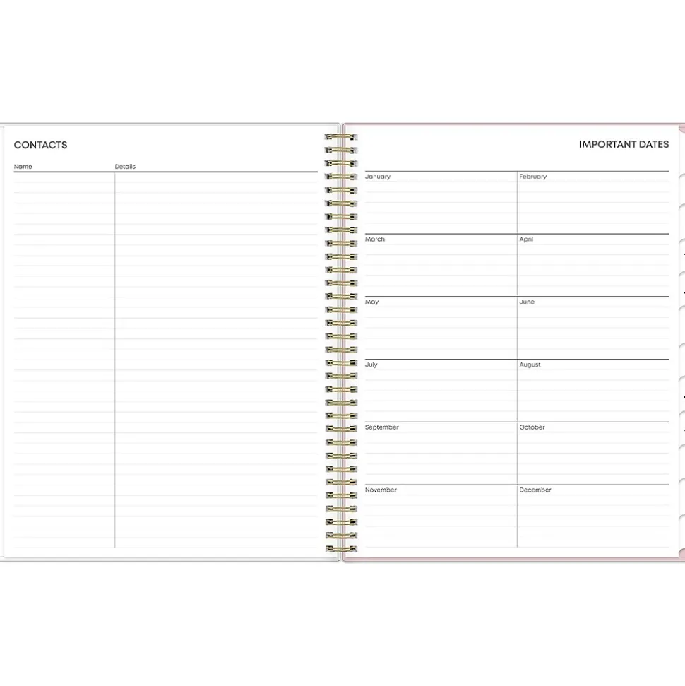 - Yearly overview, list of major holidays, and pages for your contacts, goals, important dates, and notes