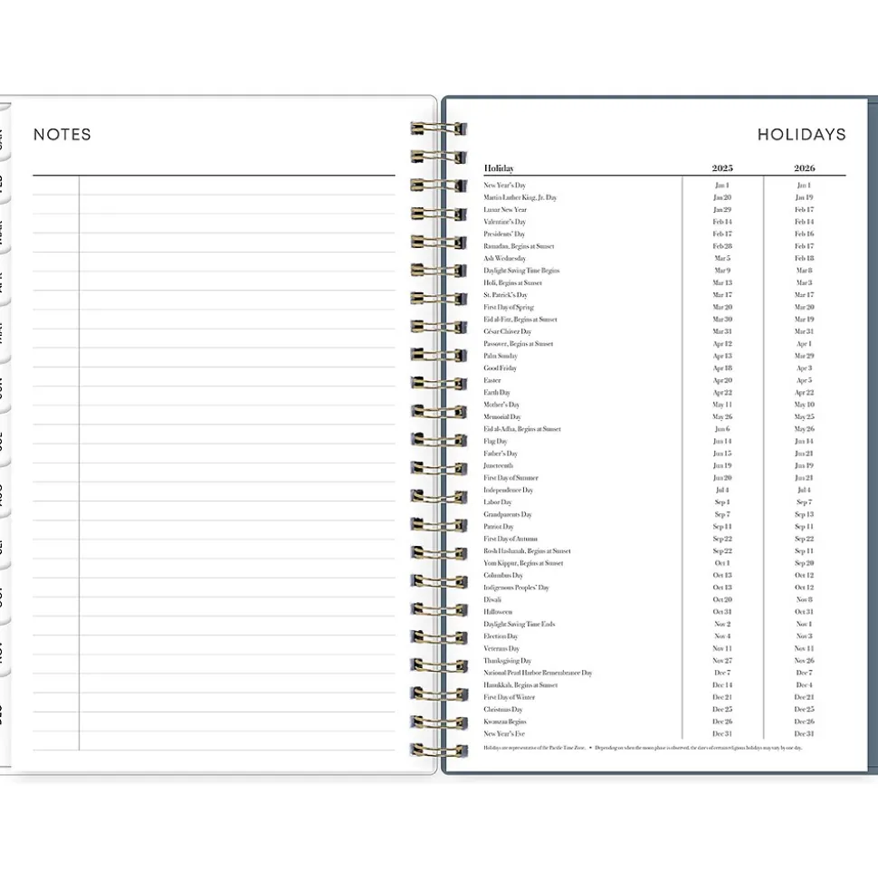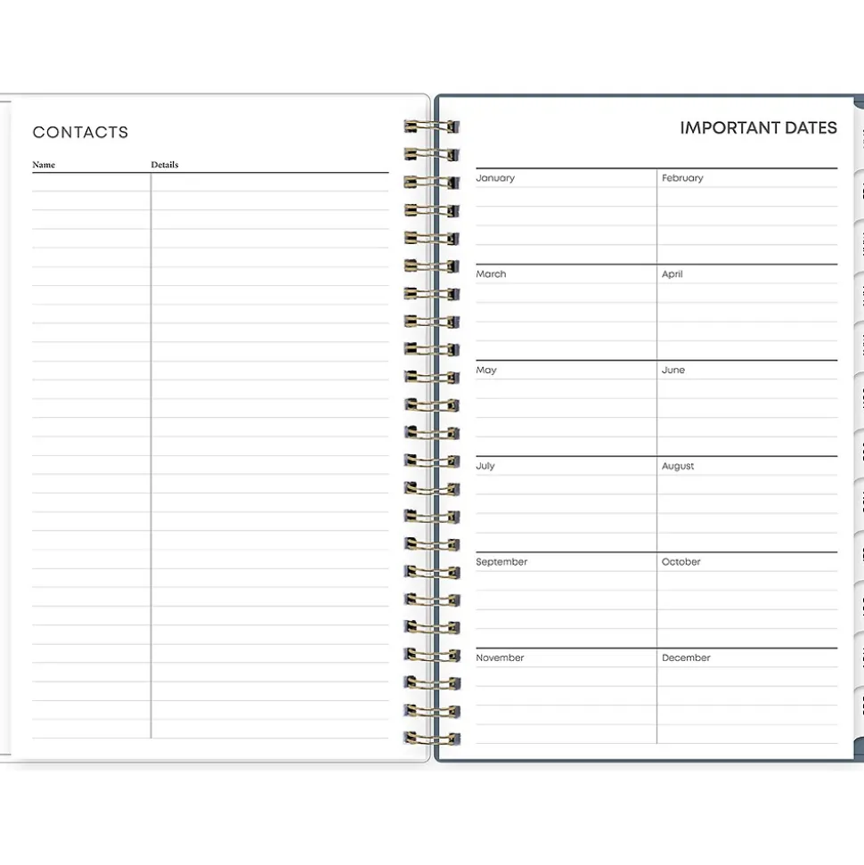 - Yearly overview, list of major holidays, and pages for your contacts, goals, important dates, and notes