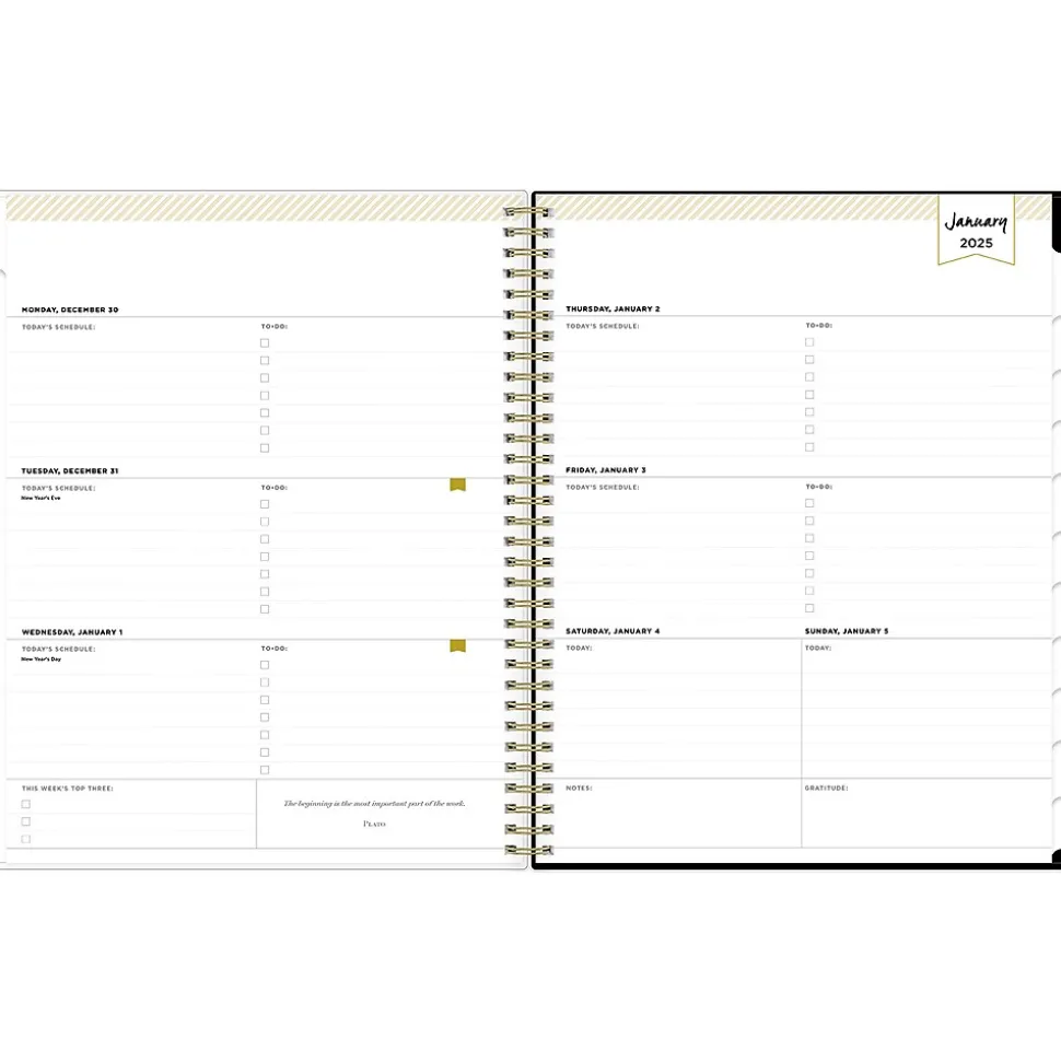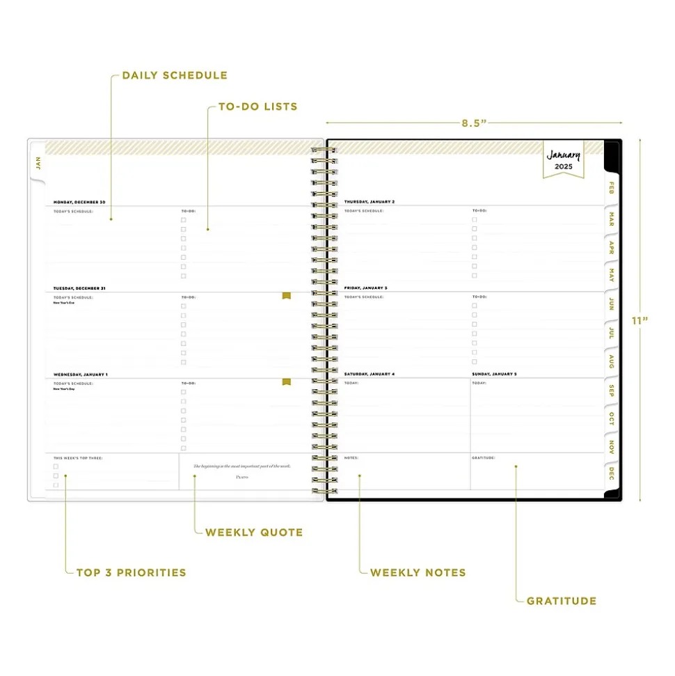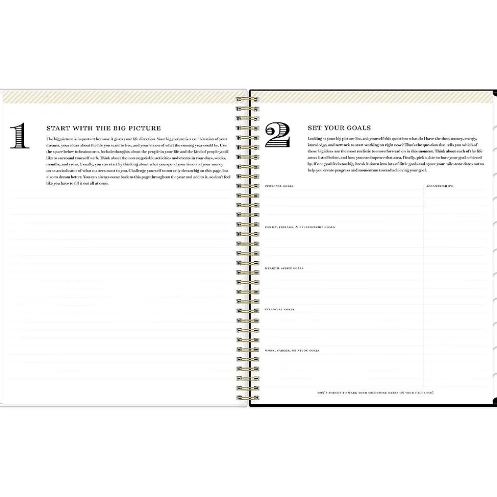 Day Designer for Blue Sky offers an elegant place to plan your year. With a customizable clear pocket cover, goal-setting worksheets, and outstanding weekly layouts, the 2025 Austen planner from Day Designer for Blue Sky helps you prioritize tasks and stay organized. It includes gold-tone foil stickers and a storage pocket for a well-designed year.