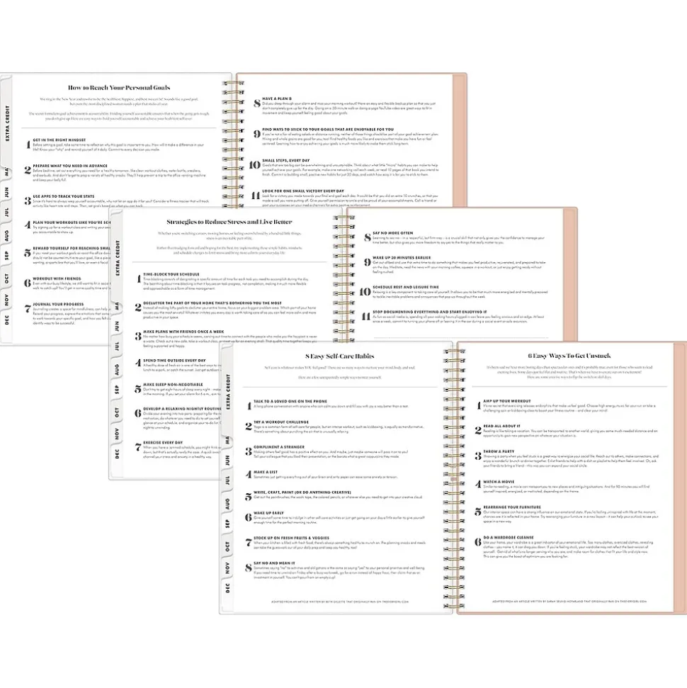 - Offers one day per page with hourly planning slots and sections for priorities, notes, and to-dos; one month per two pages, with space for notes and quick reference calendars