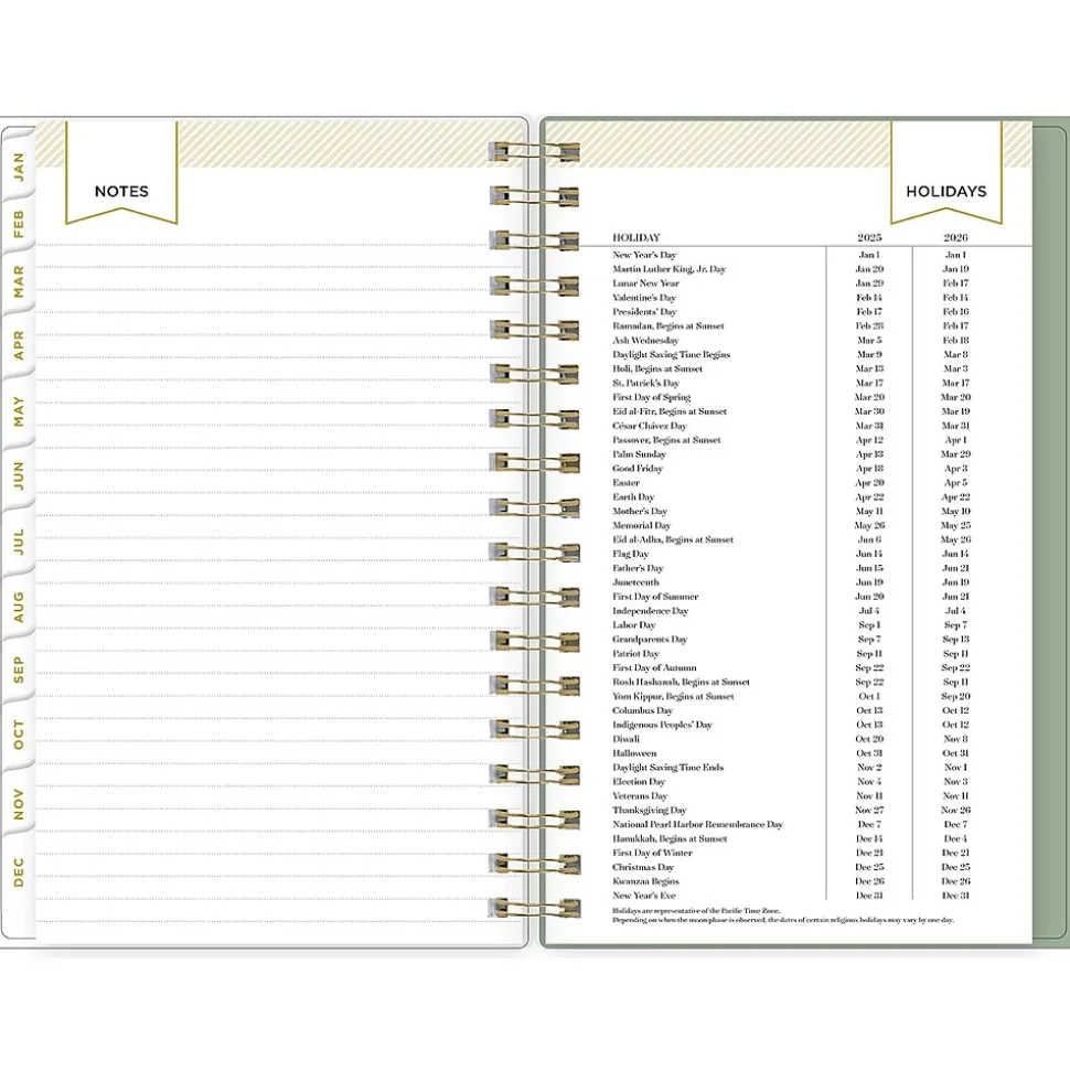 - Yearly overview, list of major holidays, and pages for your contacts, goals, important dates, and notes