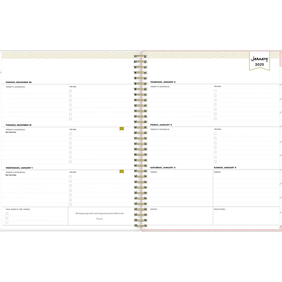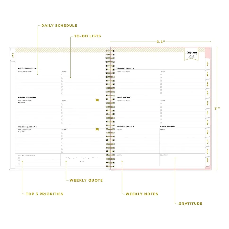 - Weekly and monthly planner covers 12 months from January 2025 to December 2025