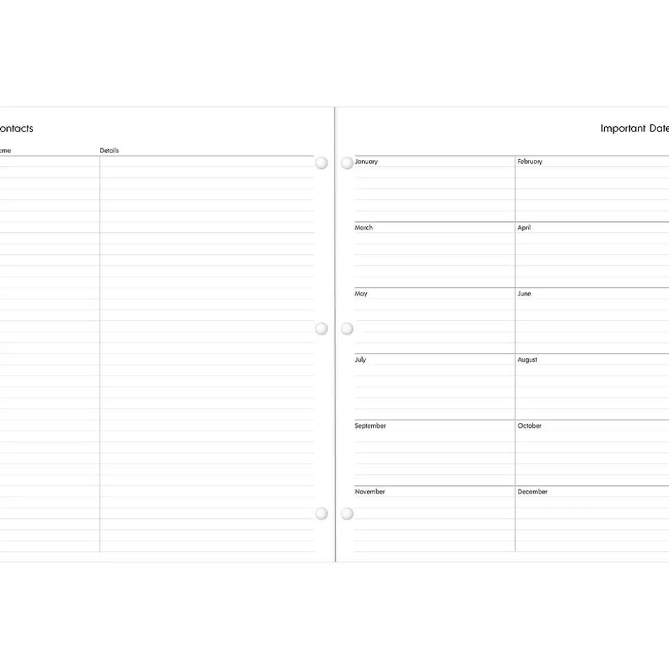 - Pages for goals, contacts, important dates, and notes