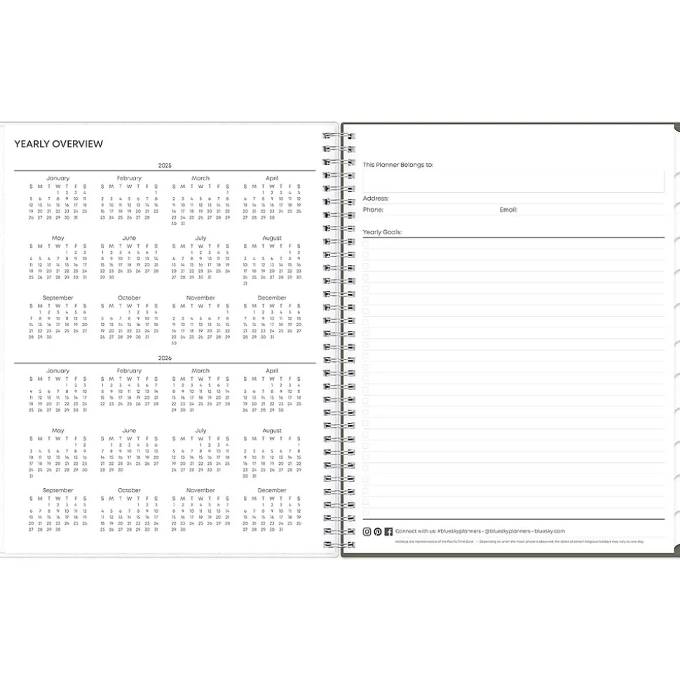 - Yearly overview, list of major holidays, and pages for your contacts, goals, important dates, and notes