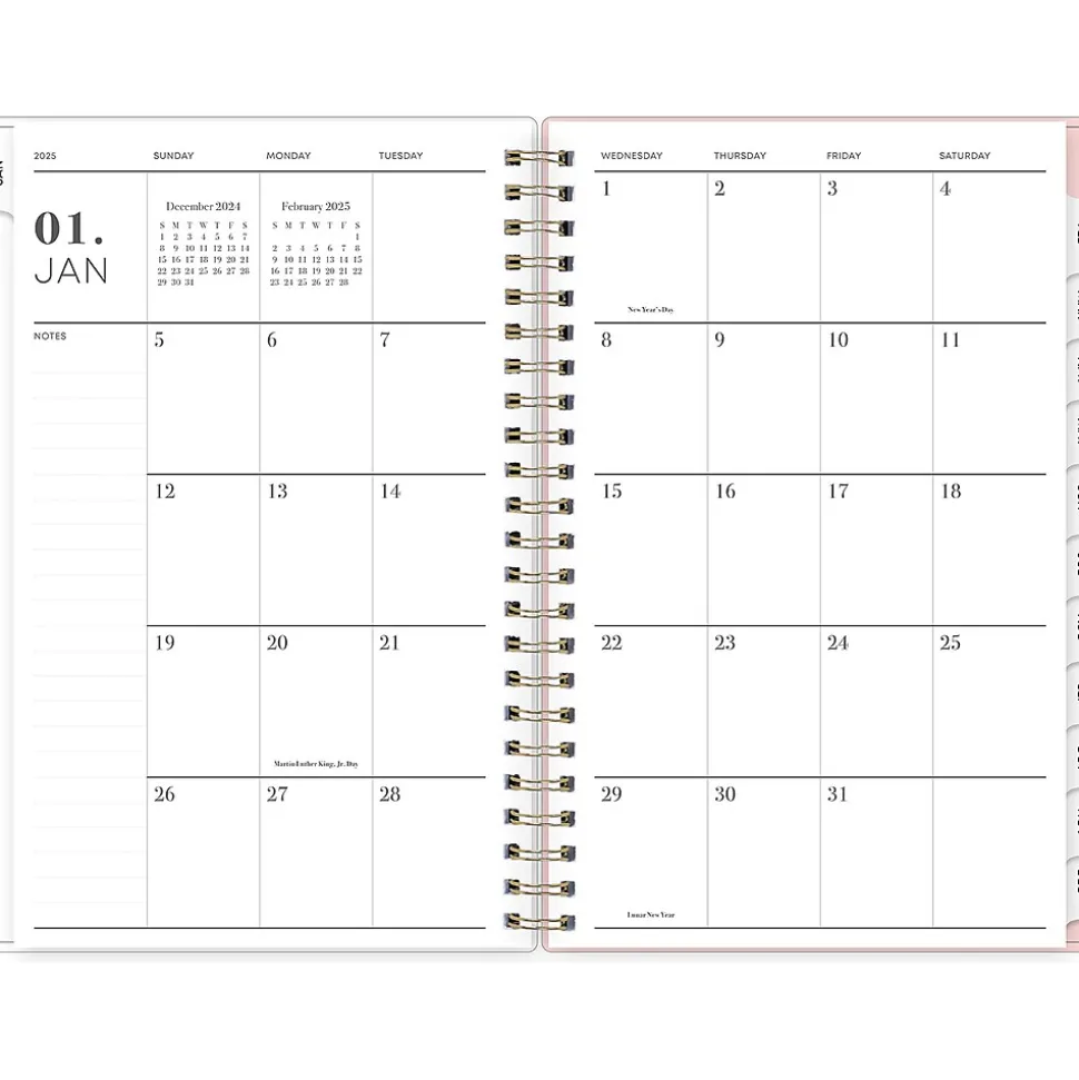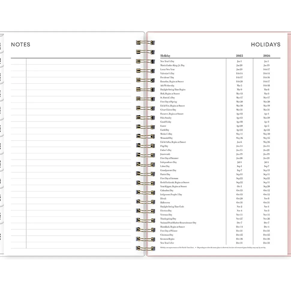 - Features two-page vertical appointment-style weekly and monthly spreads, with space for notes and quick reference calendars