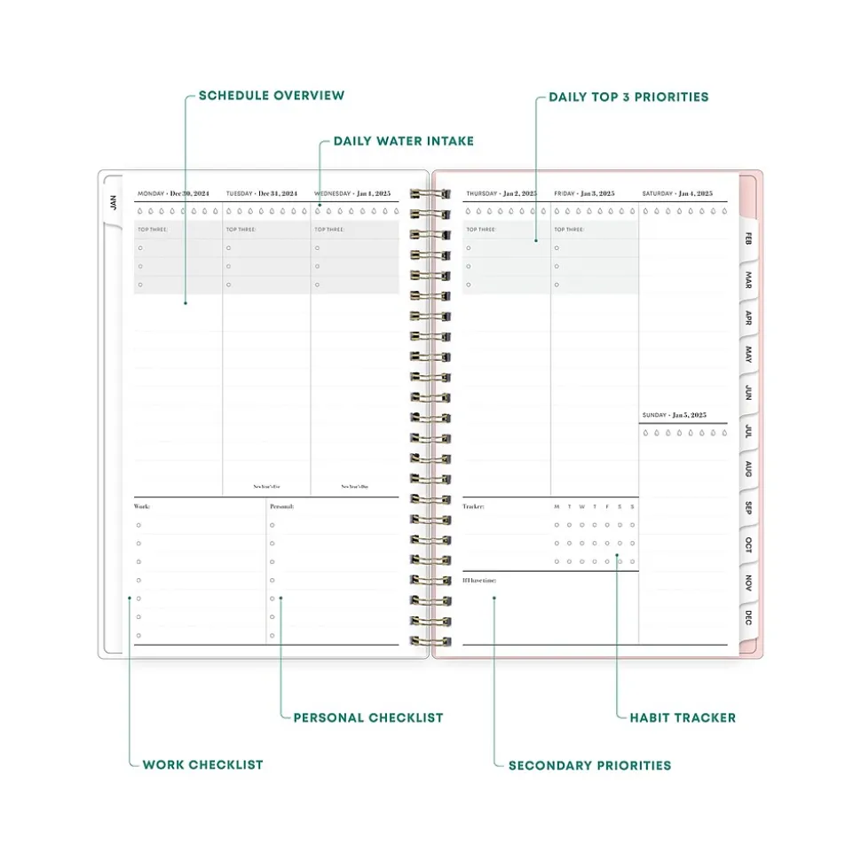 - Weekly and monthly planner covers a 12-month date range from January 2025 through December 2025