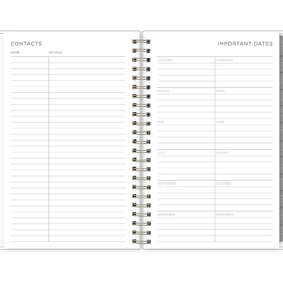 - Offers one week per two pages and one month per two pages, with space for notes and quick reference calendars