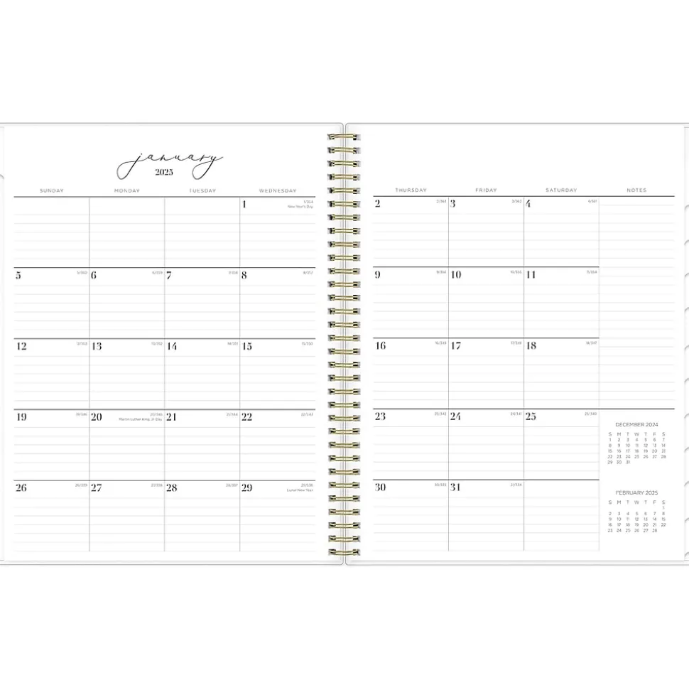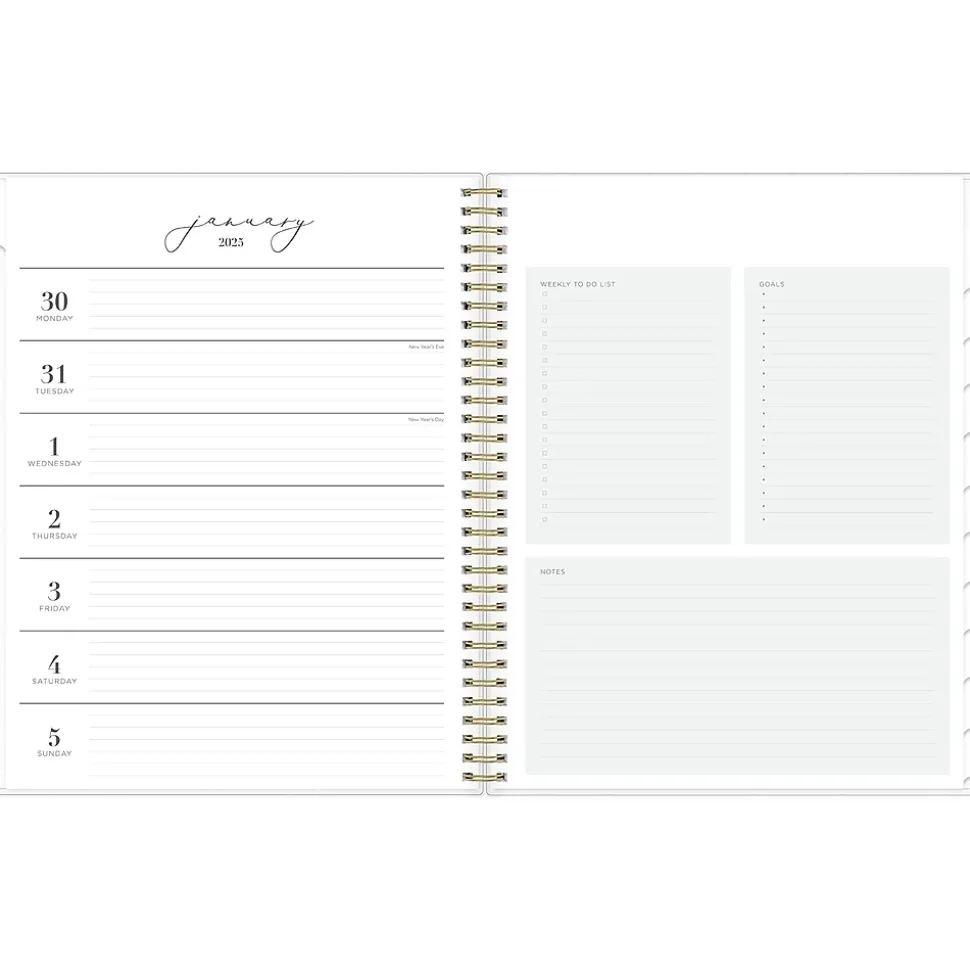 - Goal-focused weekly layouts, with the week on the left side, and sections for notes, goals, and to-dos on the right; one month per two pages offers a column for notes and quick reference calendars
