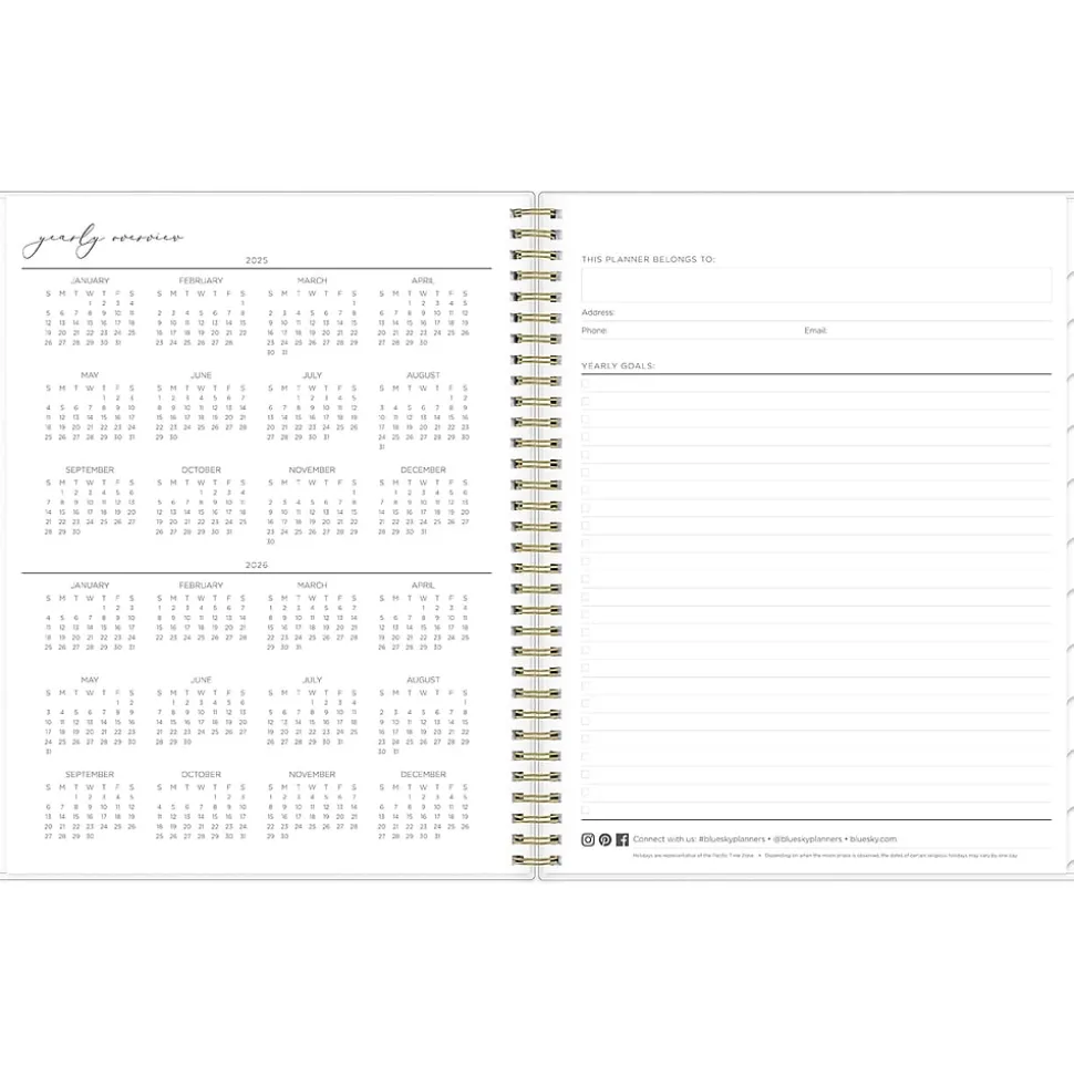 - Storage pocket, yearly overview, goals, contacts, and important dates