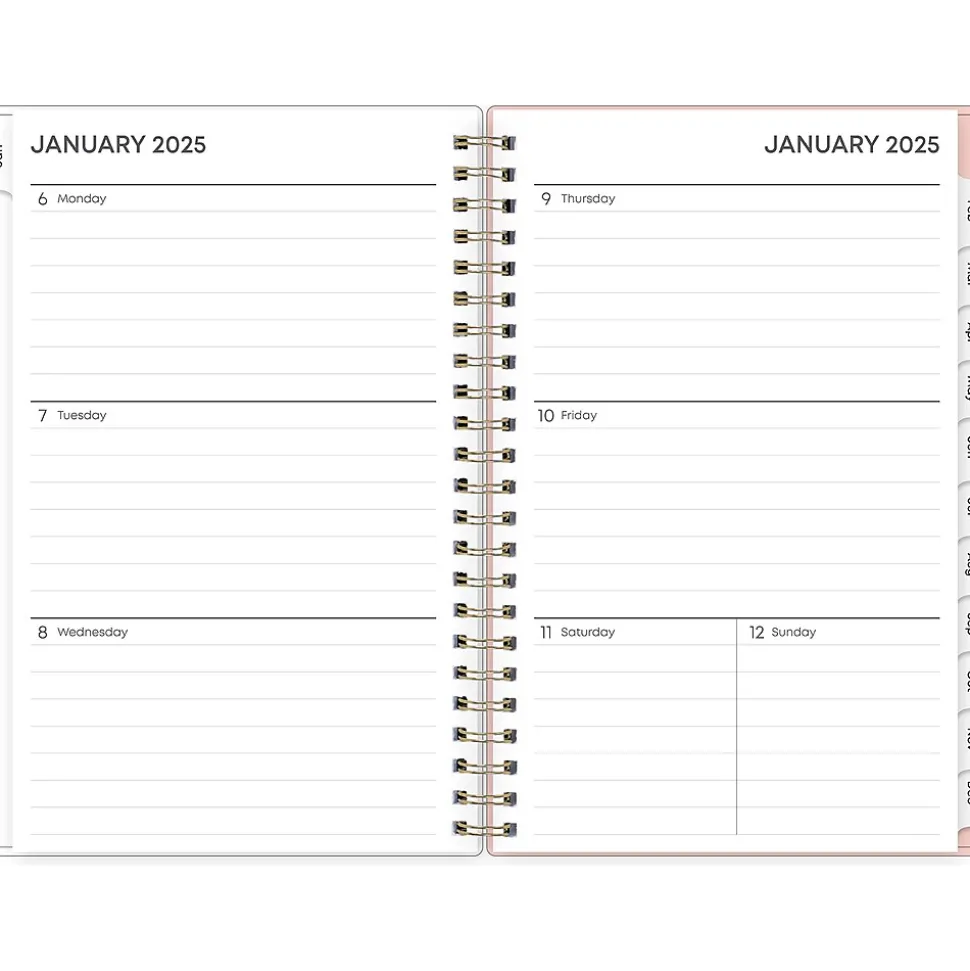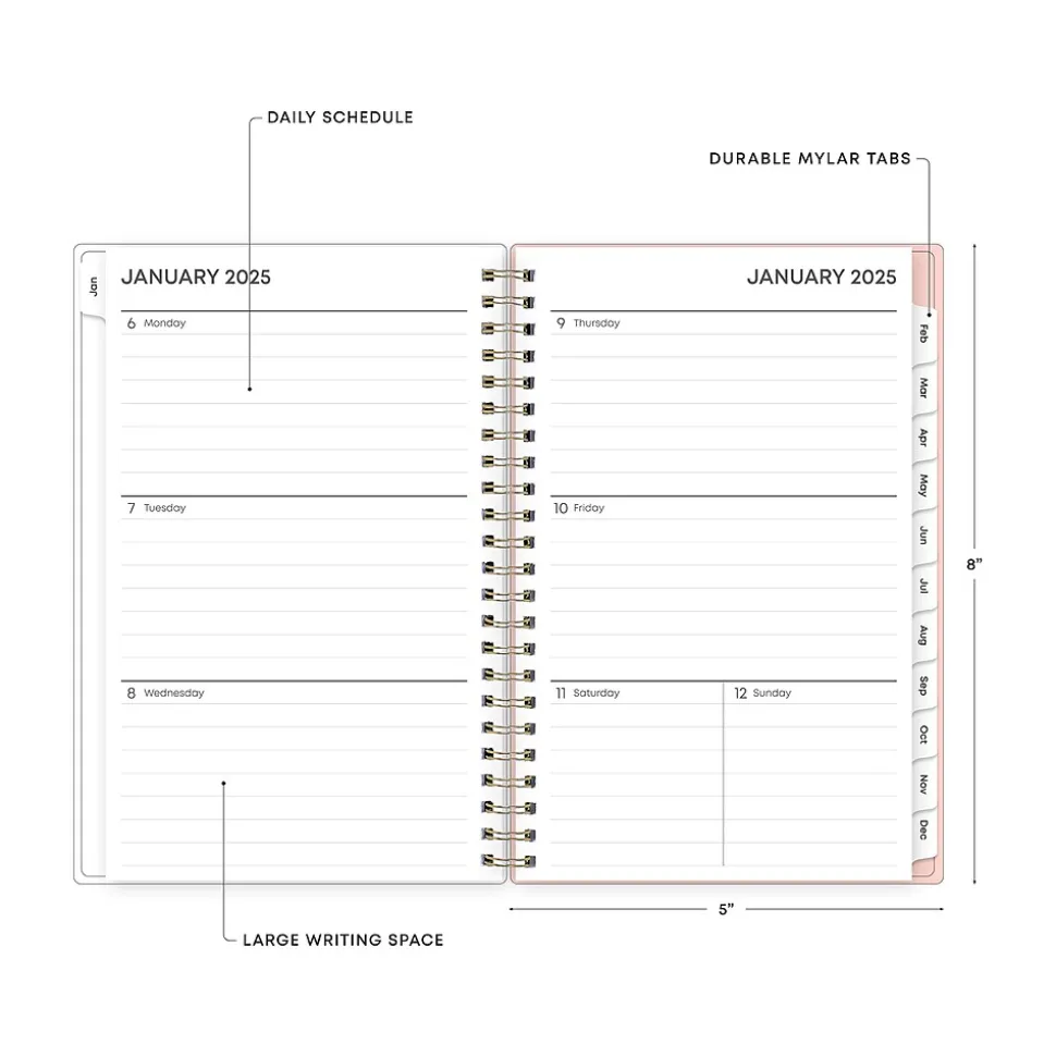 - Weekly and monthly planner covers 12 months from January 2025 to December 2025