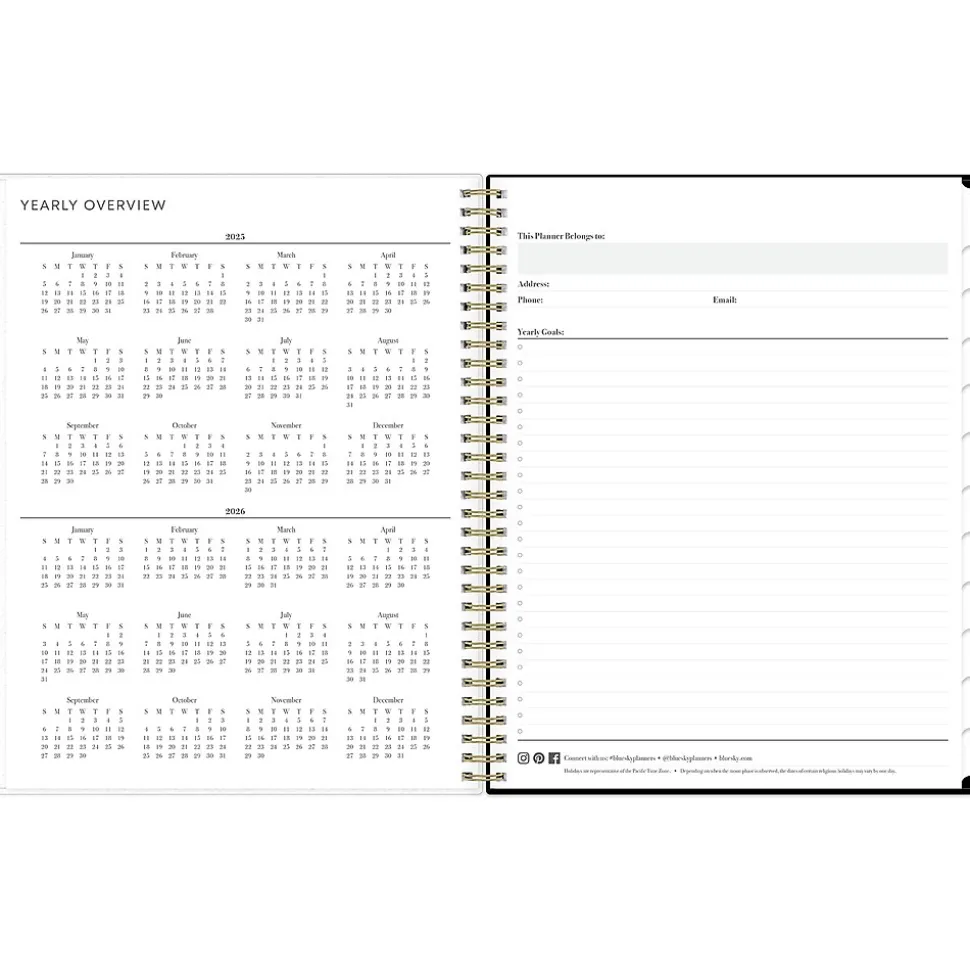 - Storage pocket, yearly overview, list of major holidays, and pages for your contacts, goals, important dates, and notes