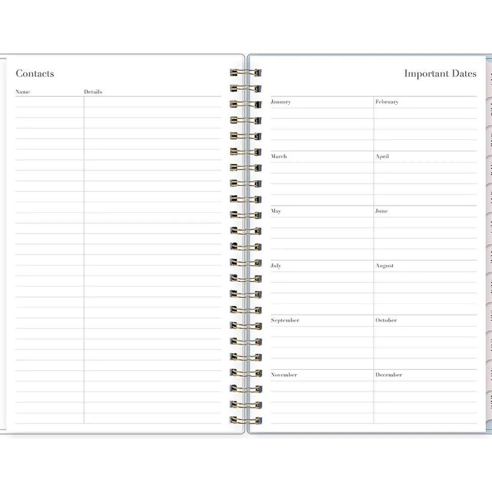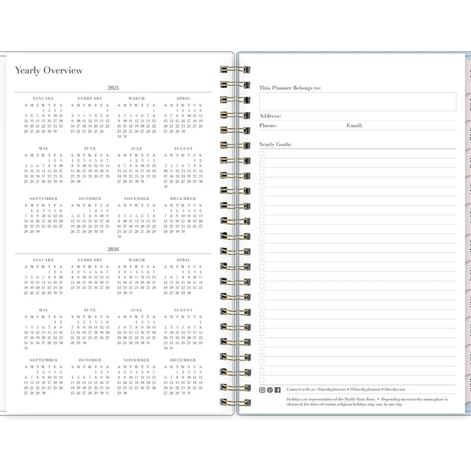 - Yearly overview, list of major holidays, and pages for your contacts, goals, important dates, and notes