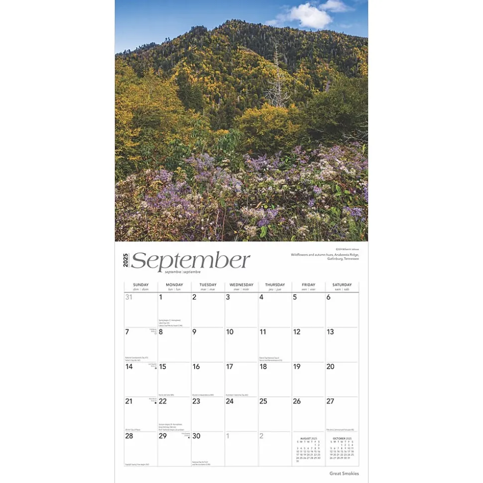 The Great Smoky Mountains, which rise on the border between North Carolina and Tennessee, stretch from the Pigeon River in the northeast to the Little Tennessee River in the southwest. This subrange of the Appalachian Mountains is home to Great Smoky Mountains National Park. This beautiful calendar includes images of the Great Smokies’ ancient mountains, lush forests, and abundant plant and animal life.