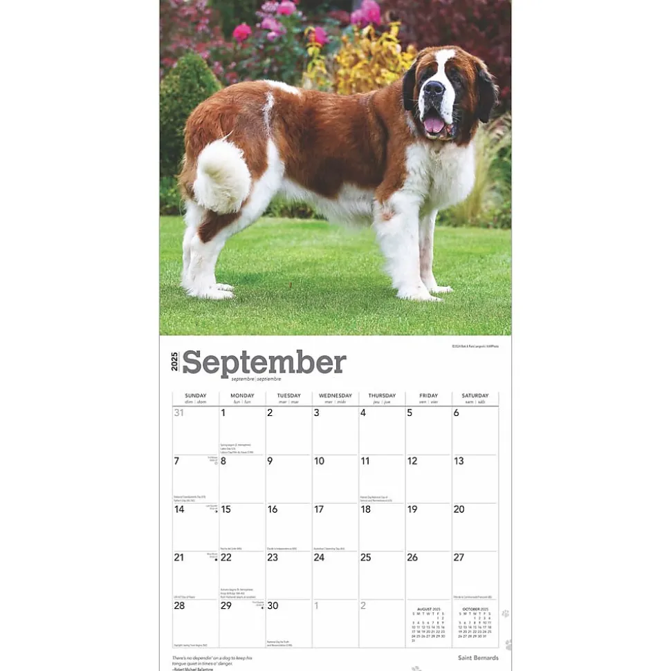 The Saint Bernard is a tough working dog originally used as a rescue dog in the Swiss Alps. The spirits carried around its neck provided the rescued with warmth to combat the cold temperatures. This big dog is also known for its loyalty, love, and gentleness. Saint Bernards (the Swiss call them “Barry” dogs) are great with children, and make wonderful family pets. This calendar is devoted to the huge, huggable Saint Bernard.