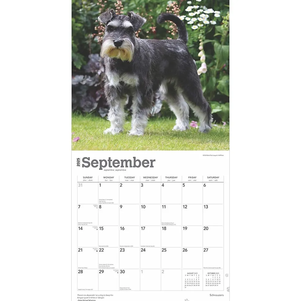 An intelligent and playful dog, the Schnauzer is a devoted companion. Originally from Germany, this dog was bred as a guard and watchdog. Some have called it a “kinder watcher” for its tendency to watch over children, and its gentle nature makes it a beloved pet. Those who love the sturdy Schnauzer will surely appreciate this wonderful calendar. This product is intended for consumers in the United States.