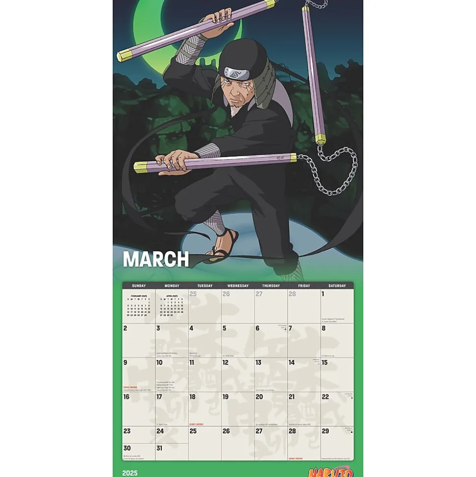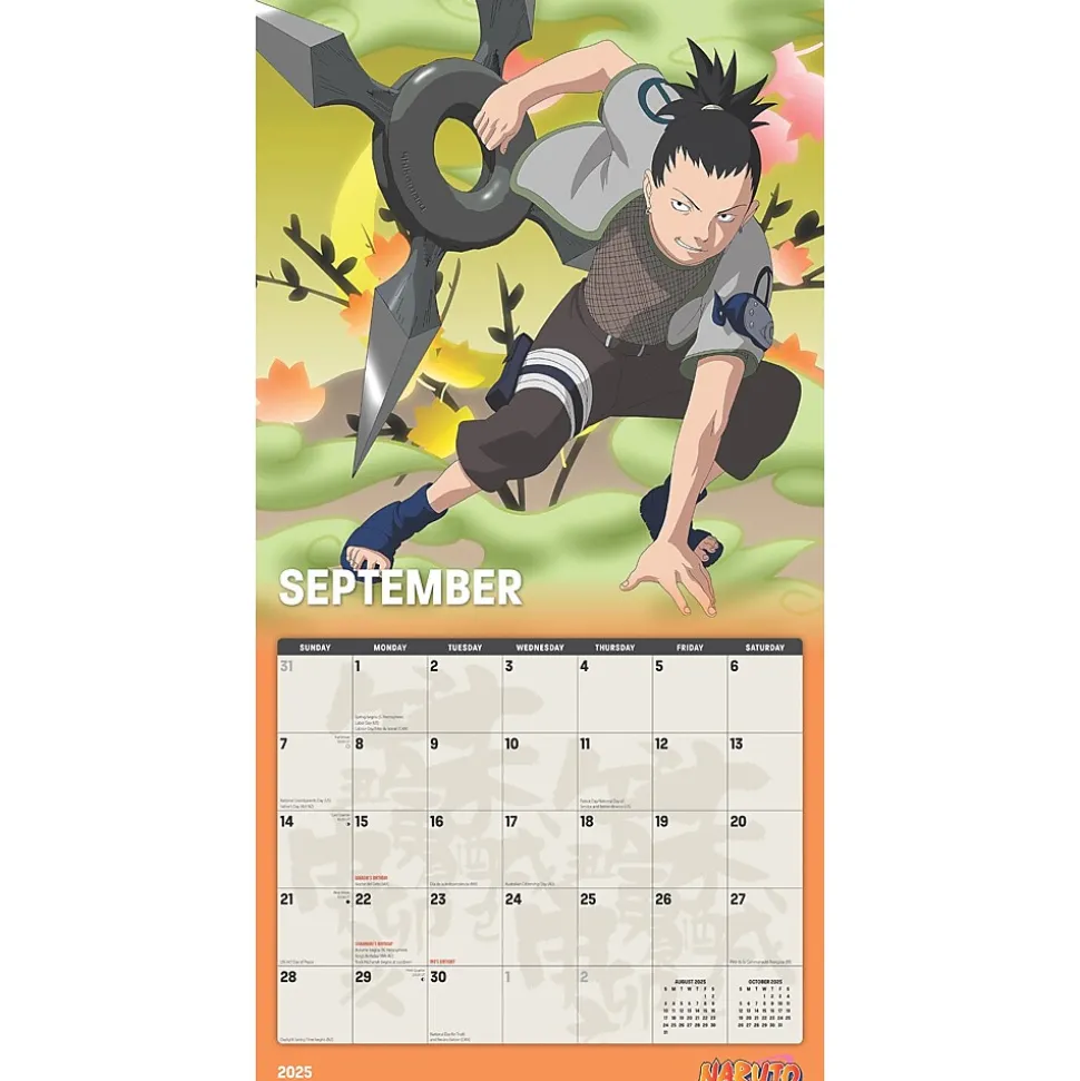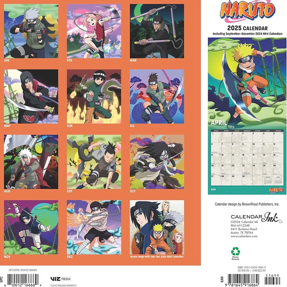In the Village Hidden in the Leaves, ninja reign supreme, and school is literally a battlefield. Naruto, Sasuke, and Sakura are teenage classmates and ninja-in-training, working together (sort of!) under the instruction of their teacher, Kakashi. Sasuke is training to win revenge… Sakura is training to win Sasuke… and Naruto, the class clown, insists that he’ll become the greatest ninja in the land! Featuring imagery and memorable characters from this beloved classic, fans will appreciate this colorful wall calendar filled with 13 illustrations to keep them excited throughout the year.