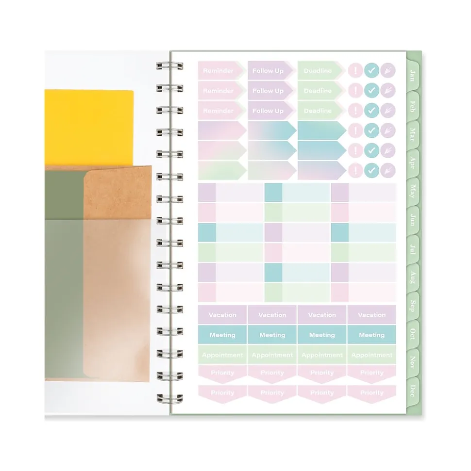 - Special pages include a double-sided poly pocket, three-year reference calendar, holiday list, two future planning pages, five note-taking pages, and a sticker sheet