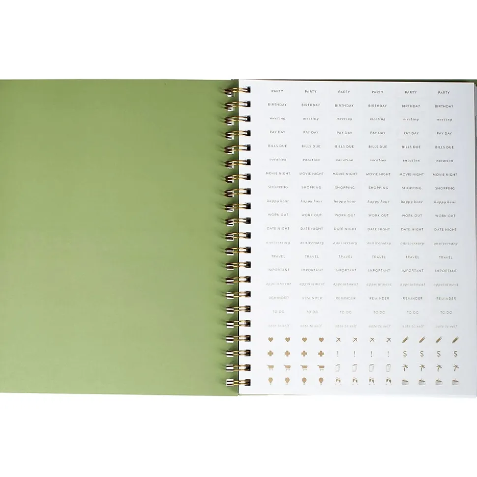Stay organized and on track with the Fringe Magnolia work-life balance planner. Features include a sturdy paperback cover with metallic gold-tone foil design accent, 12 tab dividers (spanning from January 2025 to December 2025), monthly grid spreads, weekly planning pages to track work and life activities, pages for notes, a gold-tone foil sticker sheet, and a twin-ring spiral binding.
