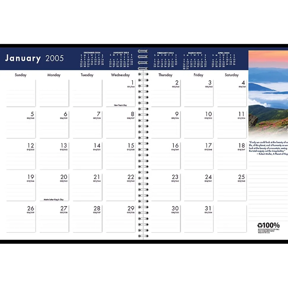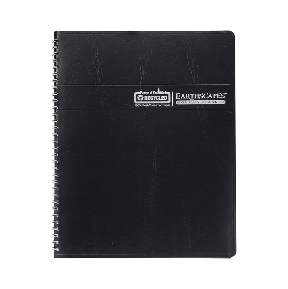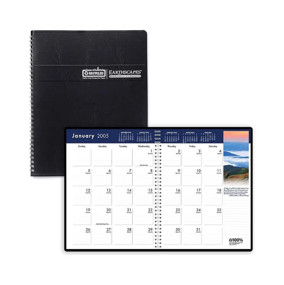 The House of Doolittle Earthscapes recycled monthly planner features a full-color nature scene with a quote to inspire on each monthly layout. The planner is wirebound with a black embossed leatherette cover to withstand the daily use throughout the year. Lightly ruled daily blocks keep notations neat. Includes a three-year reference calendar page and a three-year holiday page. Go green with House of Doolittle products, all of which are printed with soy-based inks on 100% postconsumer recycled paper. The wire binding is 90% recycled. All of House of Doolittle’s products are manufactured in the USA and FSC certified.