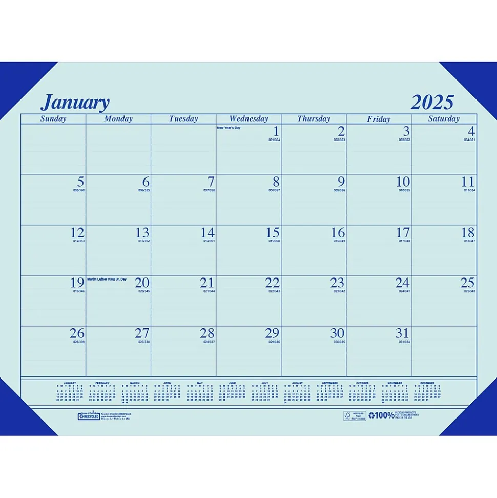 Ecotones? Desk pad. The pastel shade recalls a color from nature. Four blue chipboard-reinforced leatherette corners complement the blue paper color and keep the pages in place and protected. A full-year reference calendar aids in planning throughout the year. Lightly ruled daily blocks keep notations neat. Go green with House of Doolittle products, printed with soy-based inks on 100% postconsumer recycled paper. All of the brand’s products are manufactured in the USA and are FSC certified.