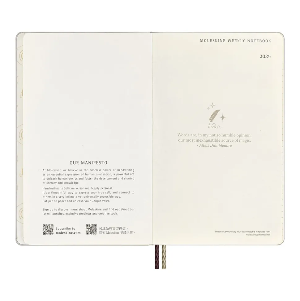 Unlock magic every day over the next year with this 12-month diary. This Moleskine Limited Edition Harry Potter Wingardium Leviosa weekly planner has a glow-in-the-dark cover and a memorable quote from the story inside. Flick through the pages to spot some important dates from the wizarding world, and grab your favorite pen to practice wand movements with the themed endpapers. Dated from January 2025 to December 2025, this Harry Potter diary has a weekly notebook layout to combine both planning and note-taking: each two-page spread shows the days of the week horizontally on the left, with a ruled page for notes, tasks, and thoughts on the right. The opening section includes a calendar and pages structured for travel planning and organization. Each diary and notebook in this collection features a spell that conjures up an iconic moment from the story. From tentative beginnings with Wingardium Leviosa to Protego Maxima and the epic final chapter. In the wizarding world, a spell is a form of expression that unlocks powerful magic, but for Harry Potter fans each familiar spell unlocks memories, evokes emotions, and provides inspiration. The real magic, of course, happens each time you express yourself with pen and paper. This diary is your everyday reminder that noting down plans by hand is the first step in making them come to life.