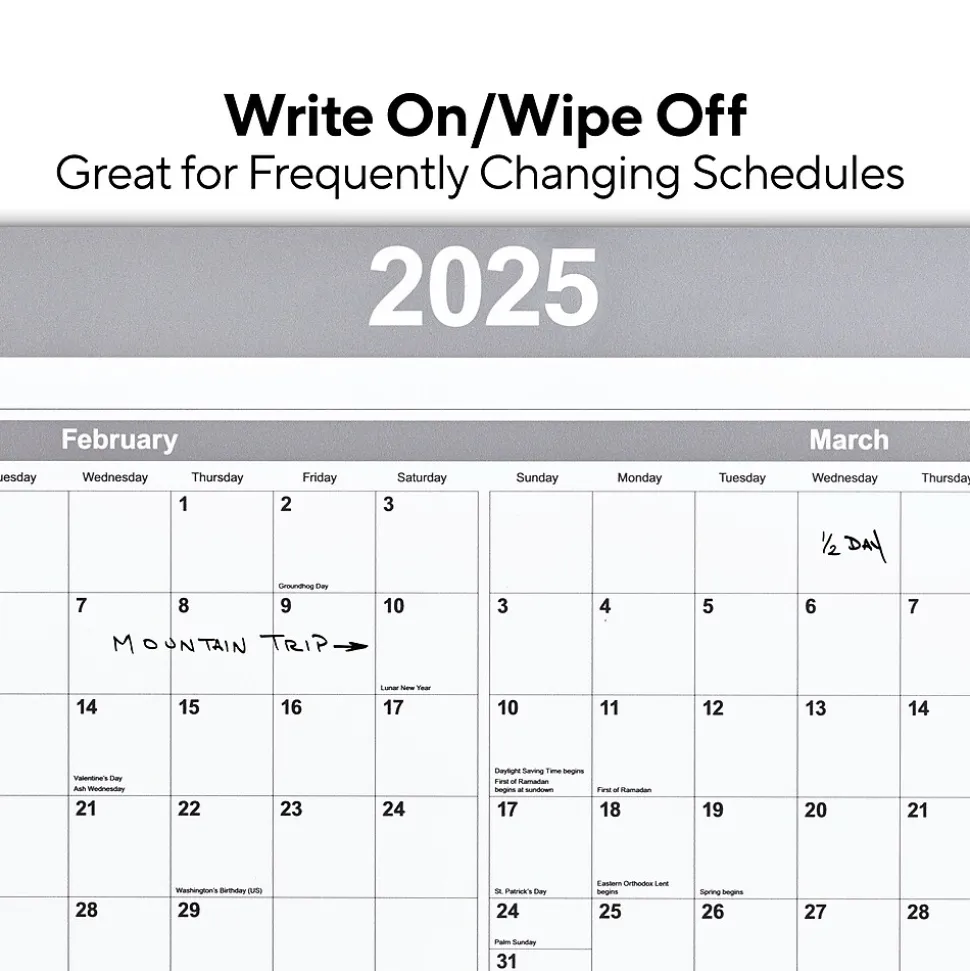 Fill in appointment dates with this erasable wall calendar. An included fine tip marker lets you easily write notes, while the gray and white design offers a distinctive look. The dry-erase laminated surface resists ghosting or staining. This Staples 36 x 24-inch gray and white erasable wall calendar has a 12-month format and supports both vertical and horizontal orientations.