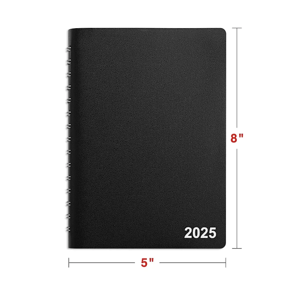 Plan your day in detail with this daily appointment book. The spiral twin-loop wire binding makes it easy to flip through the pages, while the black leatherette cover with a silver logo lends a professional look. This Staples 5 x 8-inch 2025 daily appointment book features appointment pages with 30-minute intervals so you can track important events.