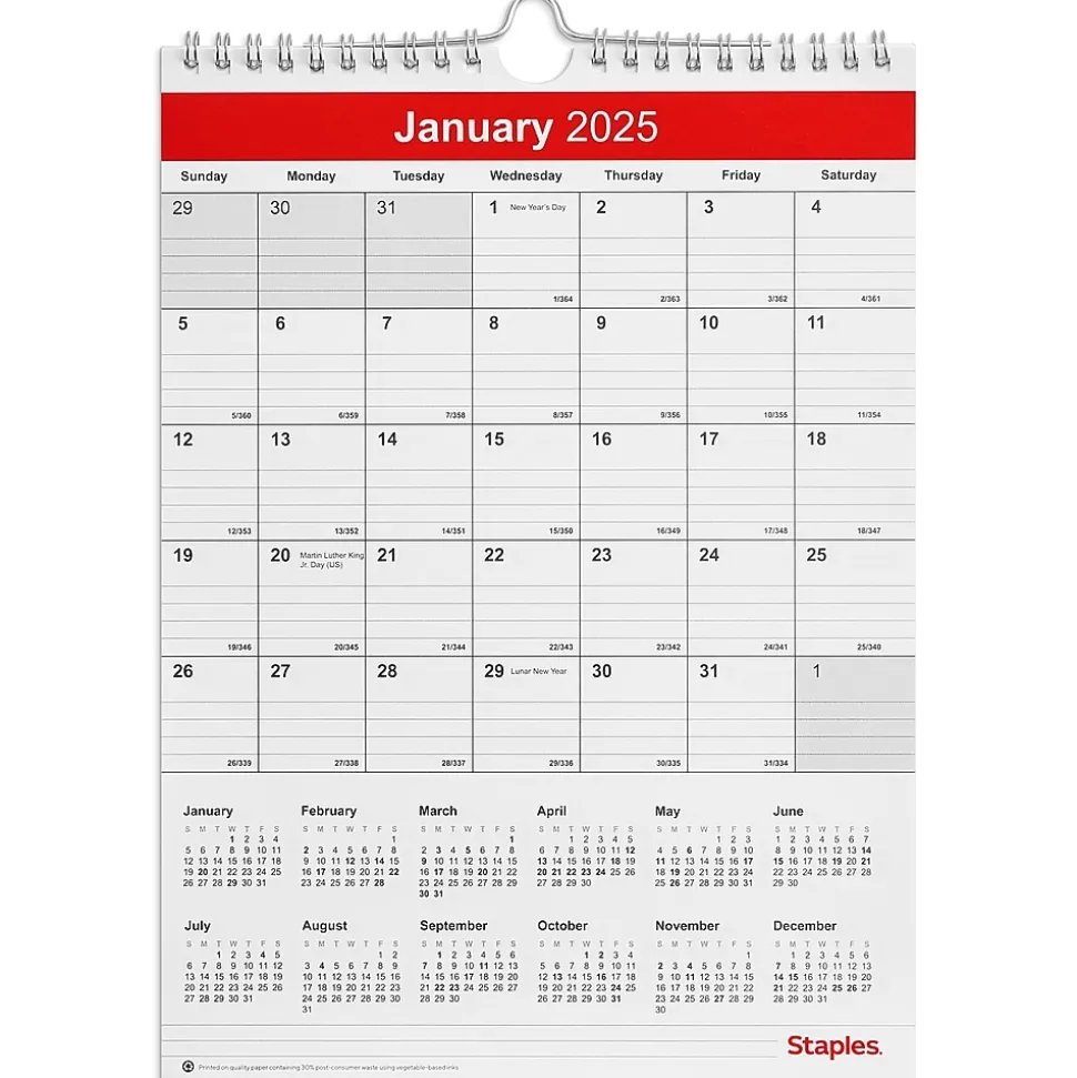 Equip your workspace with this 12-month wall calendar for 2025. The twin-wire double-loop binding allows for quick access to previous months, while the grid lines let you write down important milestones. Plan ahead easily with the monthly layout. This Staples 8 x 11-inch January 2025 to December 2025 wall calendar marks the holidays for quick reference.