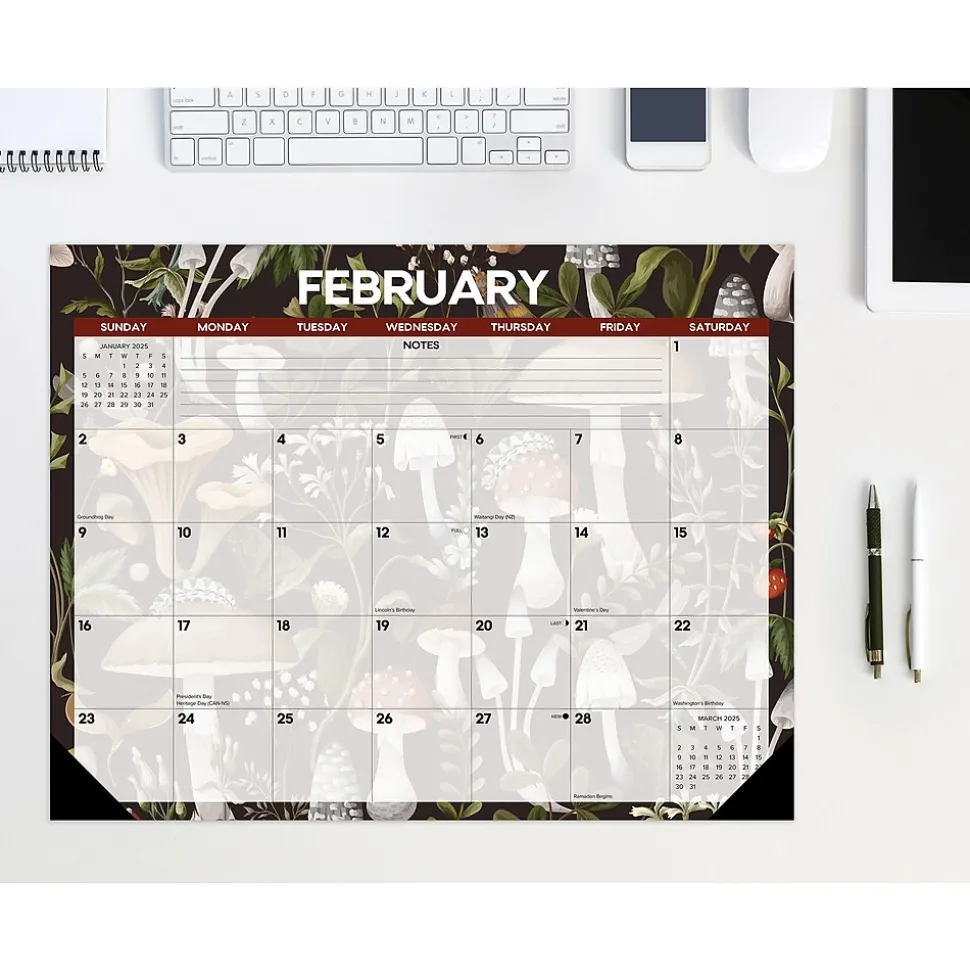 use on your desk, or hang on the wall- Stay organized in 2025 with our 22″ x 17″ Deskpad Calendar, featuring spacious grids for remembering important dates, featuring beautiful mushroom art each month.