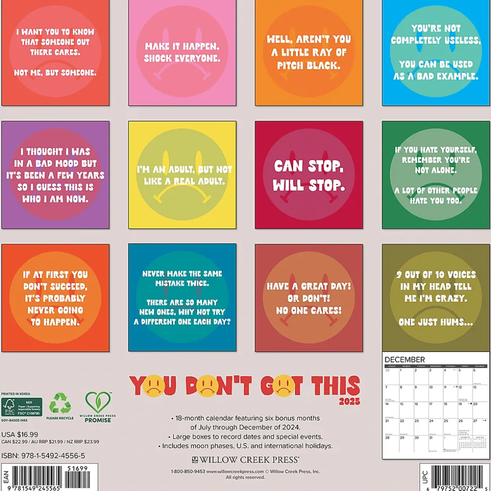 This 2025 12″x12″ wall calendar is a convenient size for the home or office – with humor and sass for the whole year. Plan important events, appointments, and plans with this annual calendar, makes a great gift – funny and anti-affirmations!