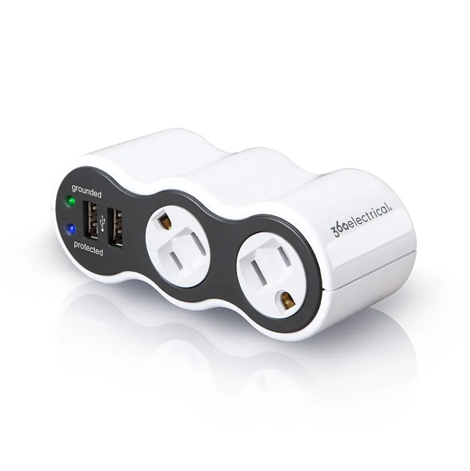 Mobile surge protector with 2 rotating outlets to fit large plugs and 2.1A dual USB ports that plugs into wall.