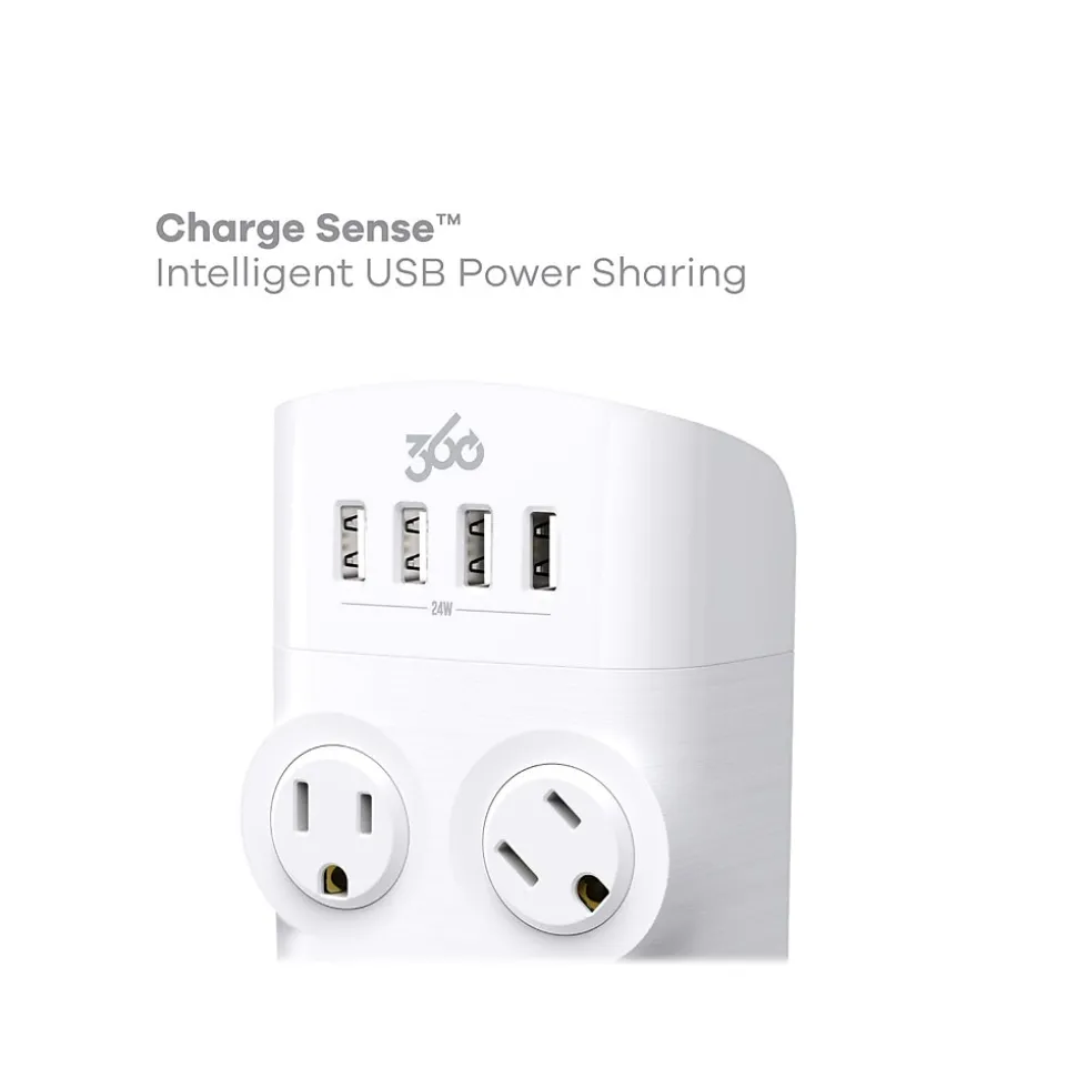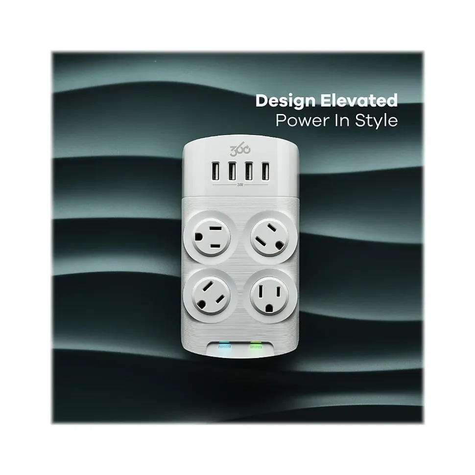 Charge all your devices with 24W of power shared across four USB Type-A ports integrated into this 360 Electrical Revolve24 four-outlet adapter. Precision-directed LEDs keep you updated without the glare. Secure your phone on the subtle yet super stable integrated cradle.