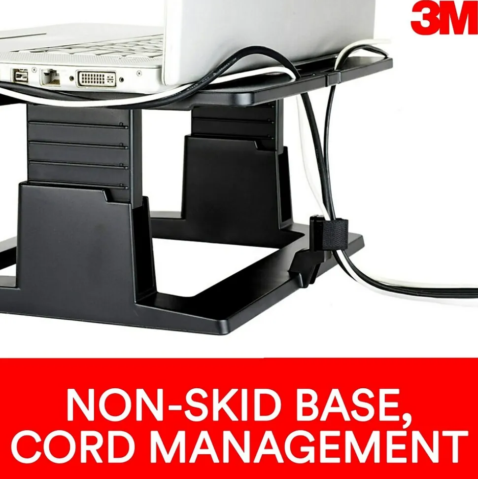 Height adjustable from 4 in to 6 in in 0.5 in increments. Slots in platform help keep laptop ventilated.