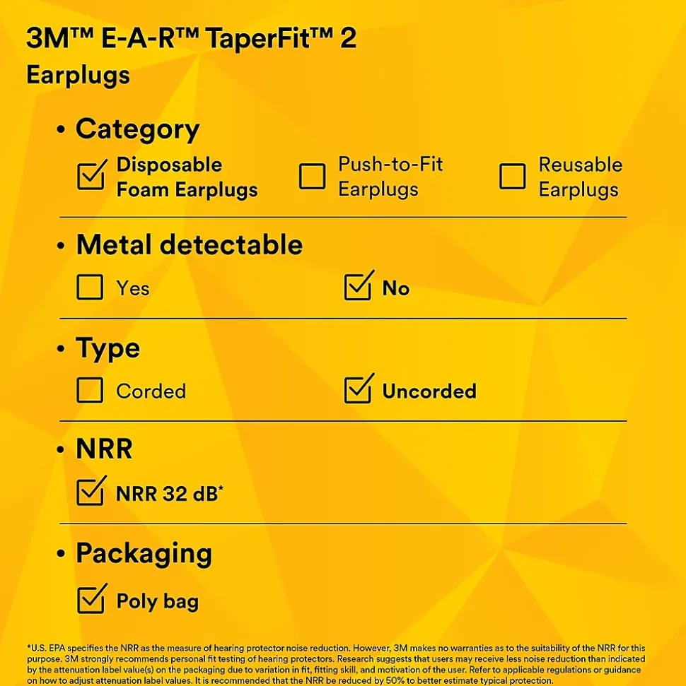 3M E-A-R TaperFit 2 corded ear plugs provide a comfortable, individualized fit and excellent attenuation. Its smooth foam expands in the ear canal to help provide comfortable hearing protection. The TaperFit 2 Ear Plugs feature a tapered design that easily and comfortably fits into the ear to help reduce your noise exposure. Simply roll the earplug between your fingers, insert it in the ear canal. The low-pressure foam expands for a snug yet gentle fit that helps block high noise levels. Bright yellow color allows supervisors to conduct a quick visual hearing protection compliance check. Recommended applications include assembly and mechanical, chipping, chiseling, cleaning, drilling, furnace operations, grinding, heavy equipment operations, machining, metal repair, painting, pouring/casting, power fastening, riveting, sanding, sawing and welding. These earplugs are commonly used in the following industries: agriculture, automotive, chemicals, construction, general manufacturing, healthcare, oil and gas, and pharmaceuticals.