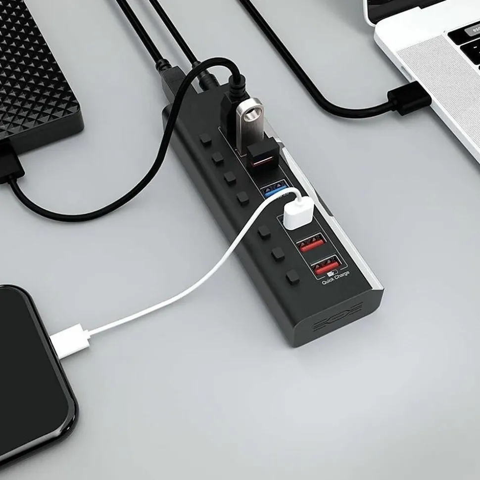 Introducing the 4XEM 7-Port USB-A Data Hub with Power Adapter-your ideal solution for expanding connectivity and charging efficiency. Built to industry standards, this USB 3.2 Gen 1 hub provides rapid data transfer speeds of up to 5 Gbps, ensuring that file transfers and peripheral connections happen without delay. Equipped with four high-speed USB 3.2 Type-A ports for data transfer and three additional ports with Quick Charge (QC) 3.0 technology, this hub guarantees fast and reliable charging for your devices.